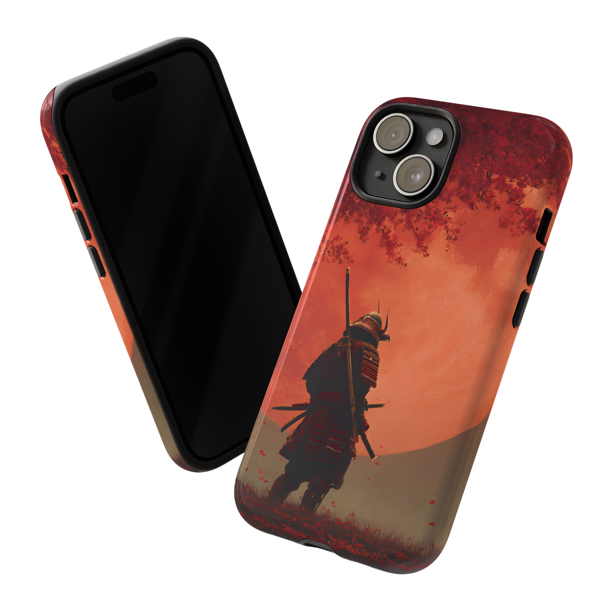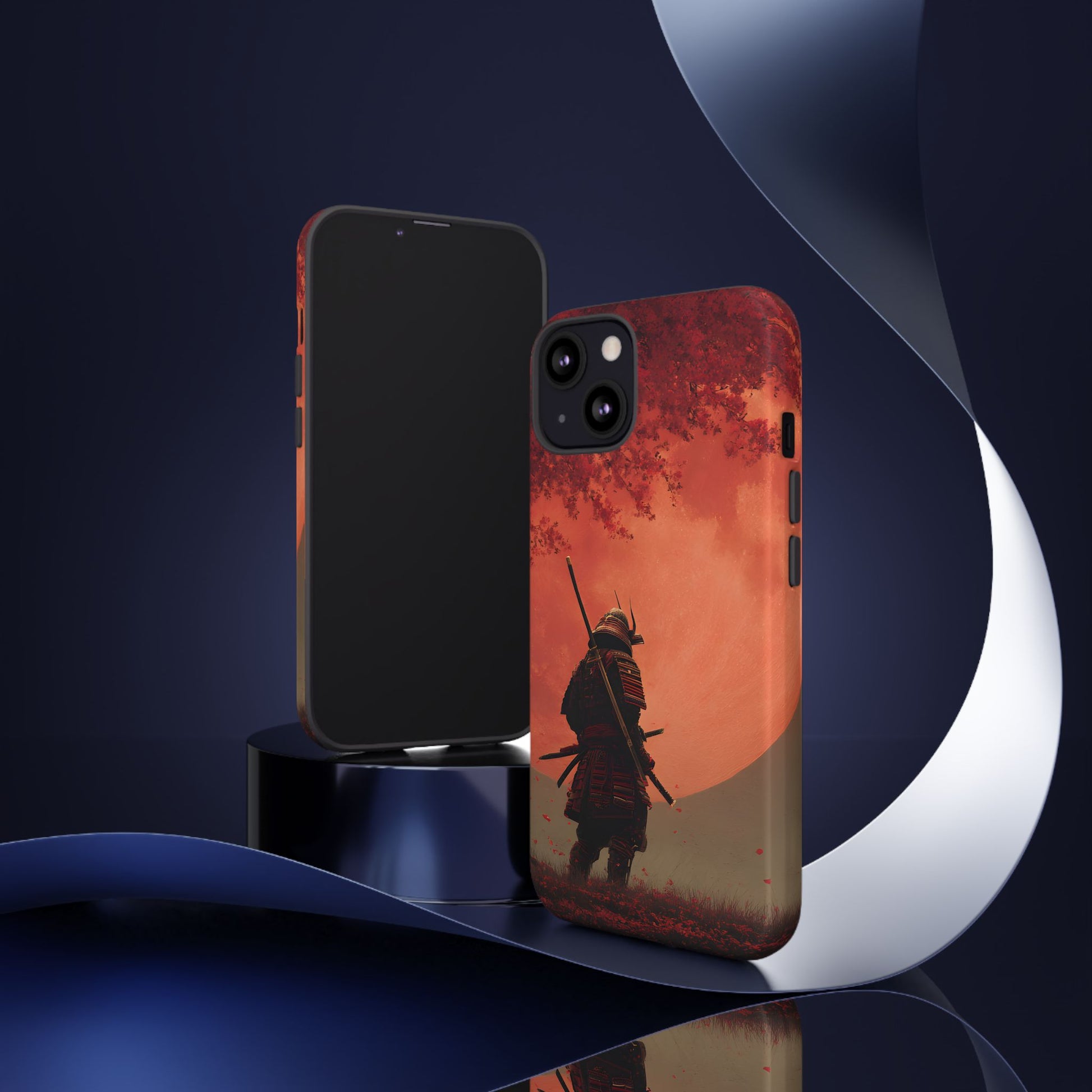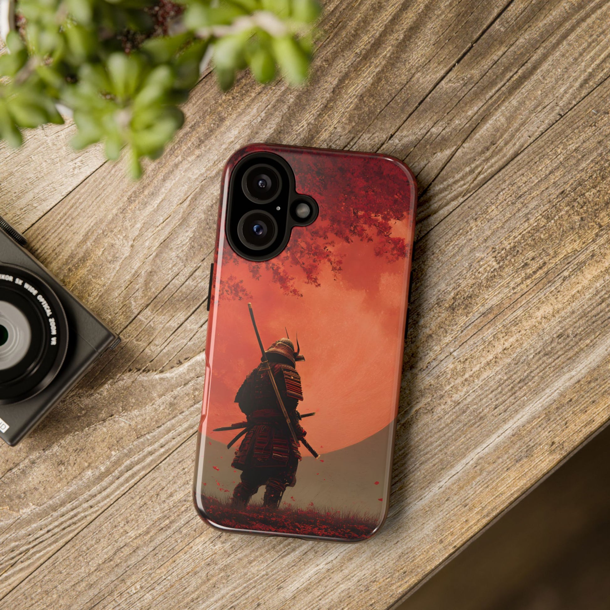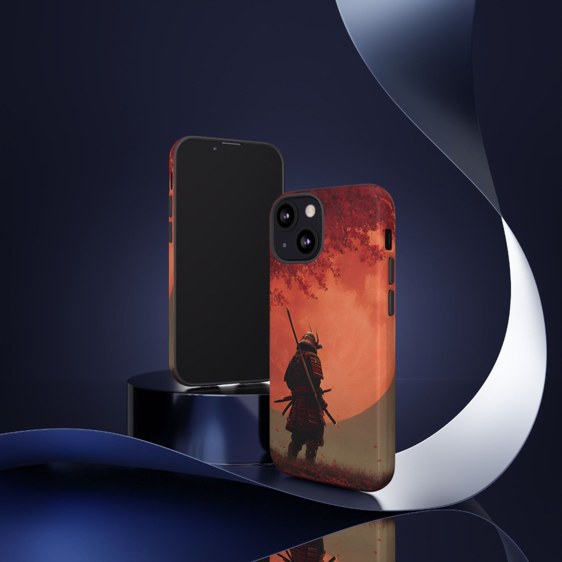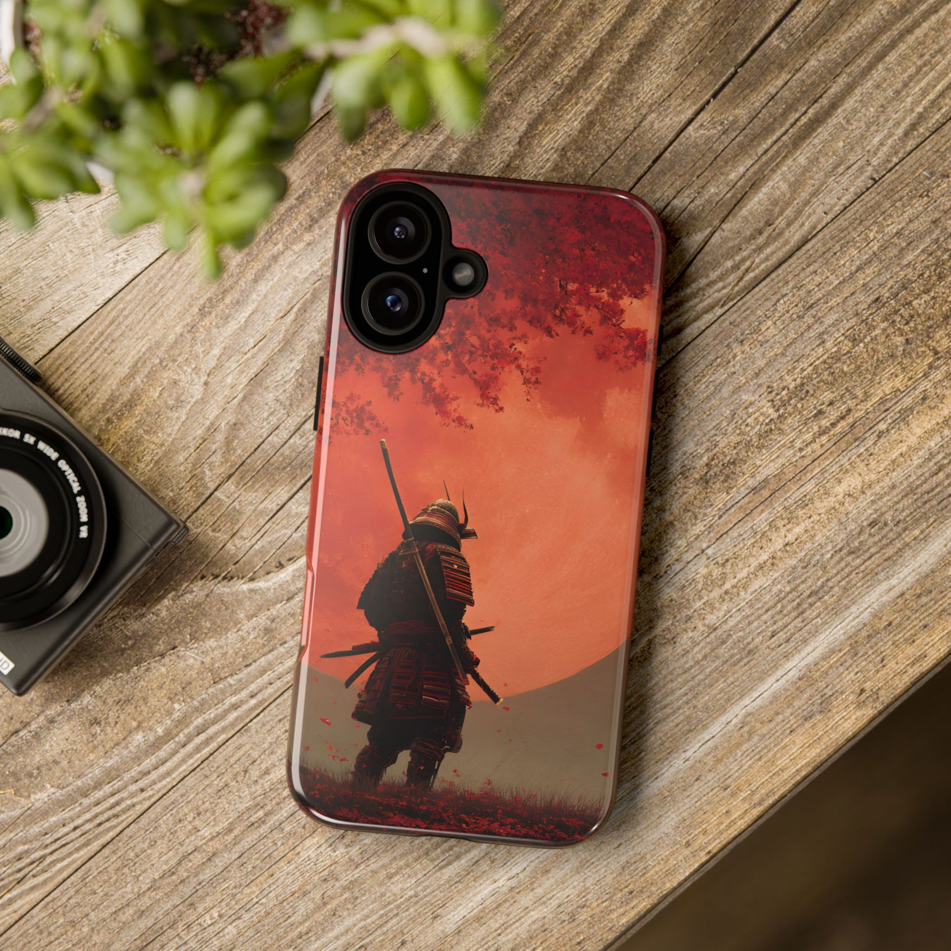 A lone samurai stands beneath a glowing blood-red moon, surrounded by drifting cherry blossoms and the silence of twilight. This striking design transforms your iPhone into a canvas of stillness, strength, and legend—perfect for those drawn to ancient honor, quiet power, and bold visuals.