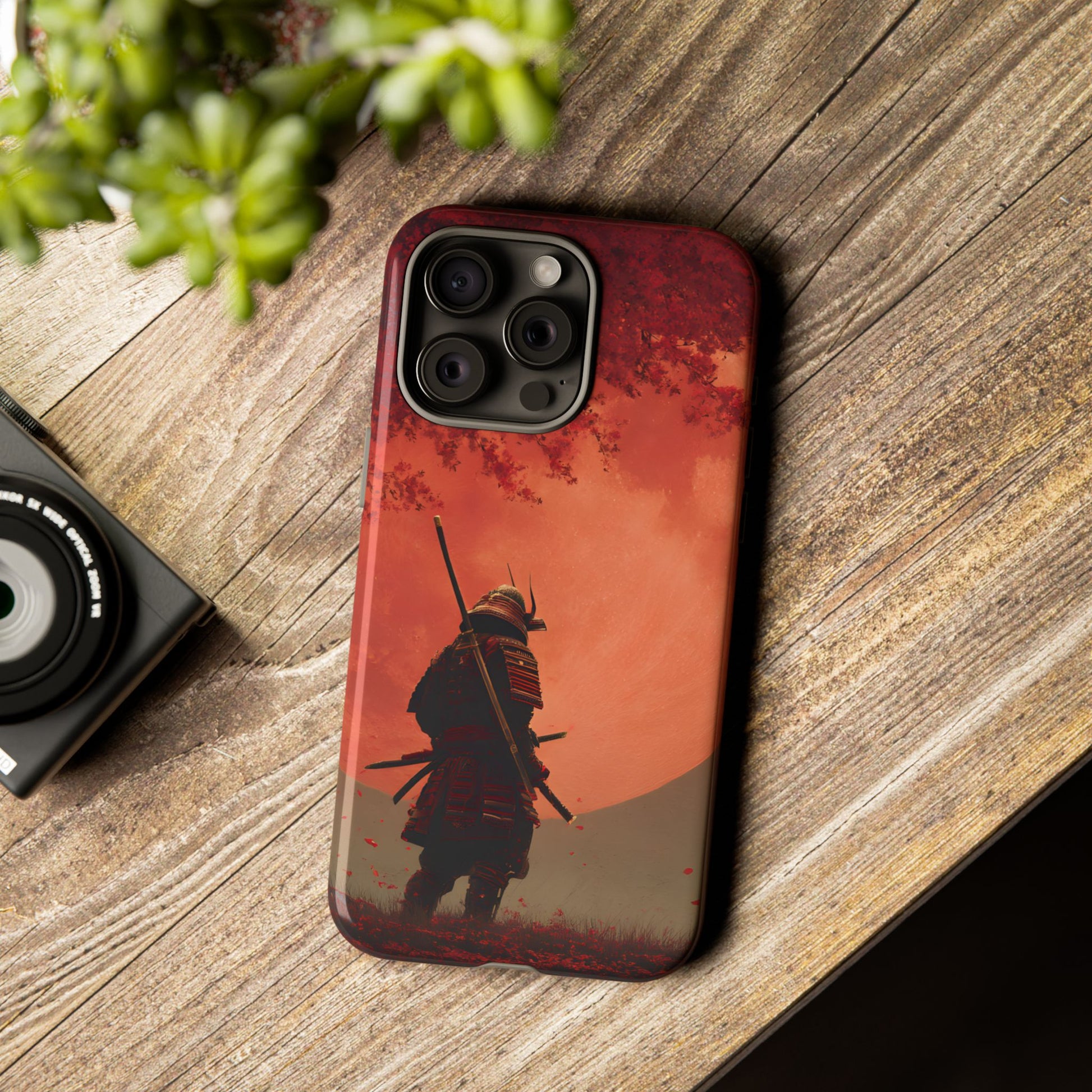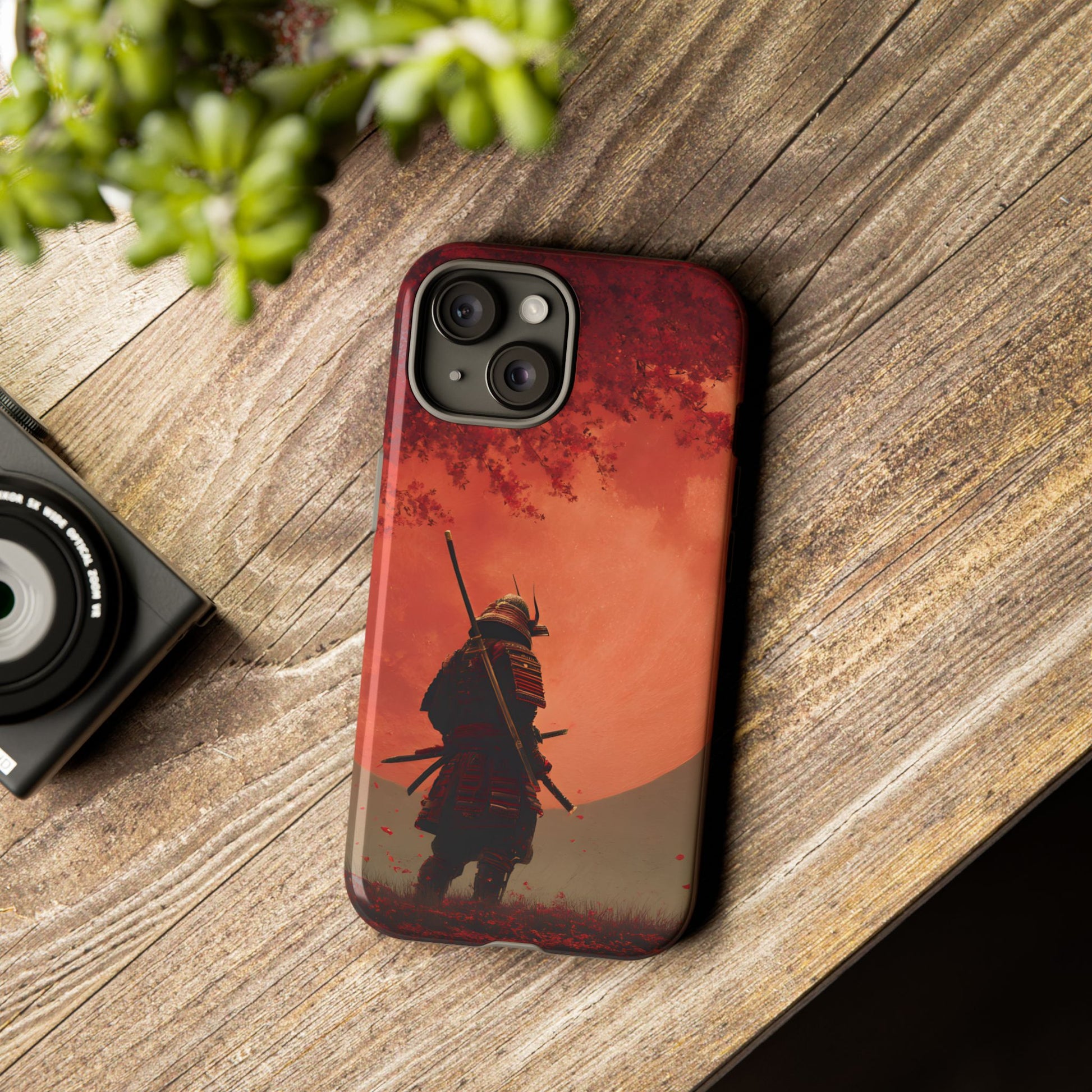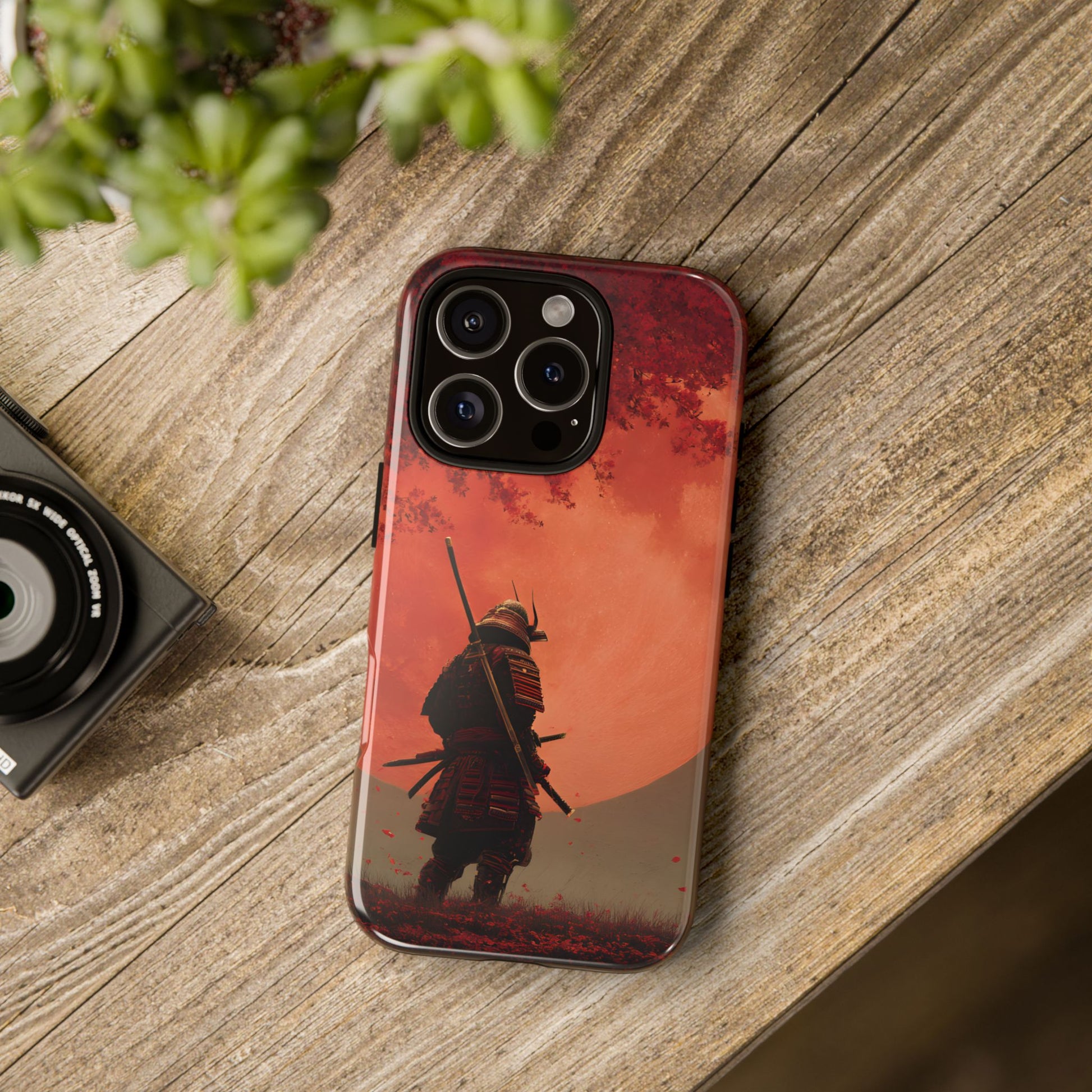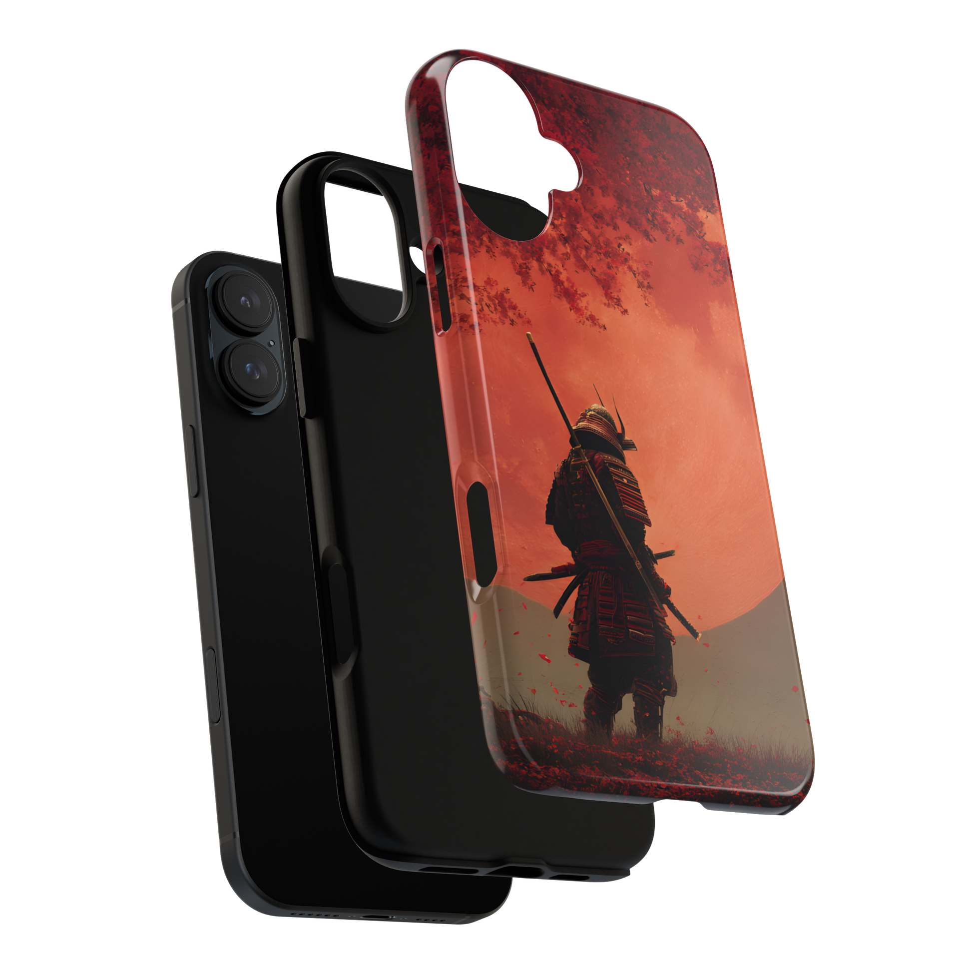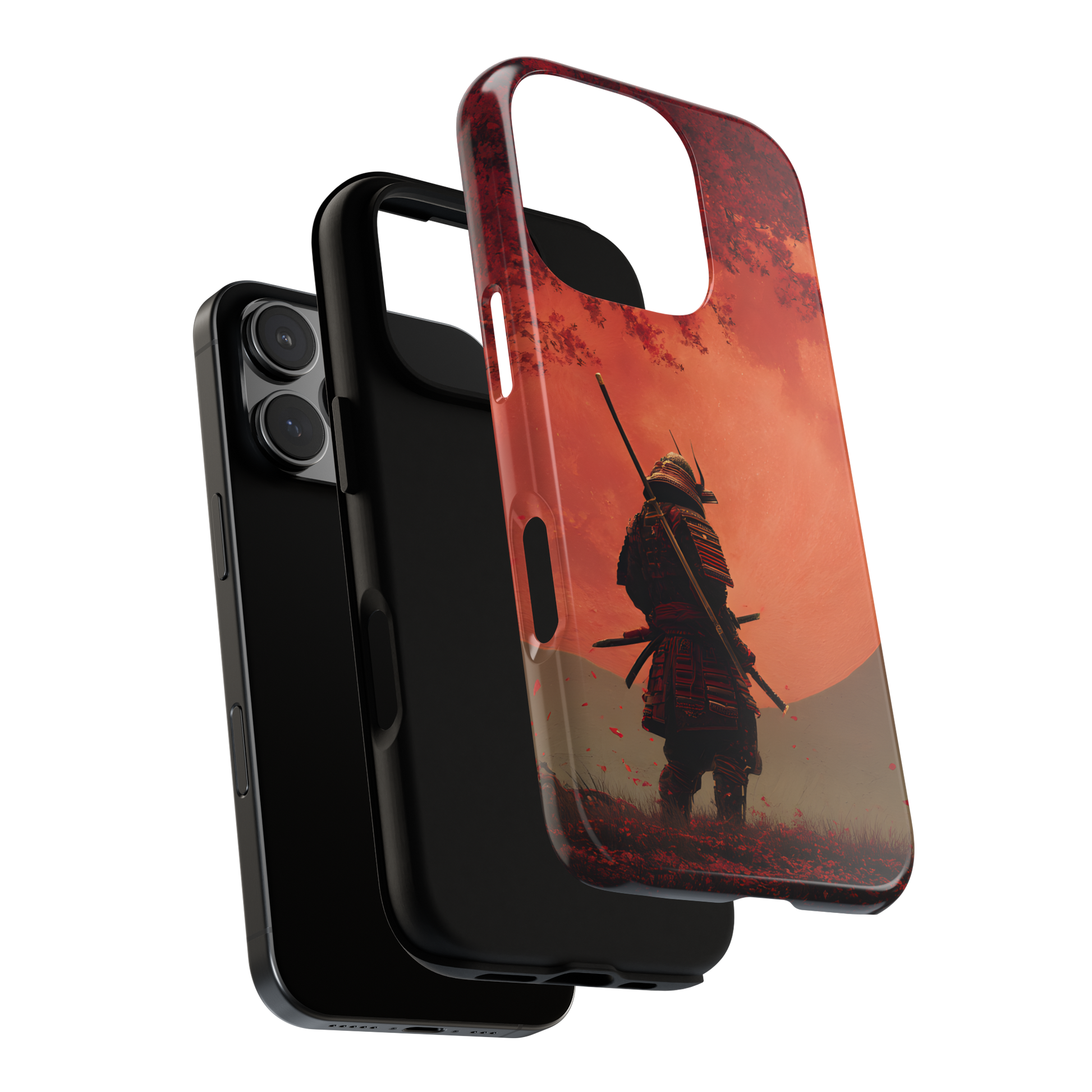 A lone samurai stands beneath a glowing blood-red moon, surrounded by drifting cherry blossoms and the silence of twilight. This striking design transforms your iPhone into a canvas of stillness, strength, and legend—perfect for those drawn to ancient honor, quiet power, and bold visuals.