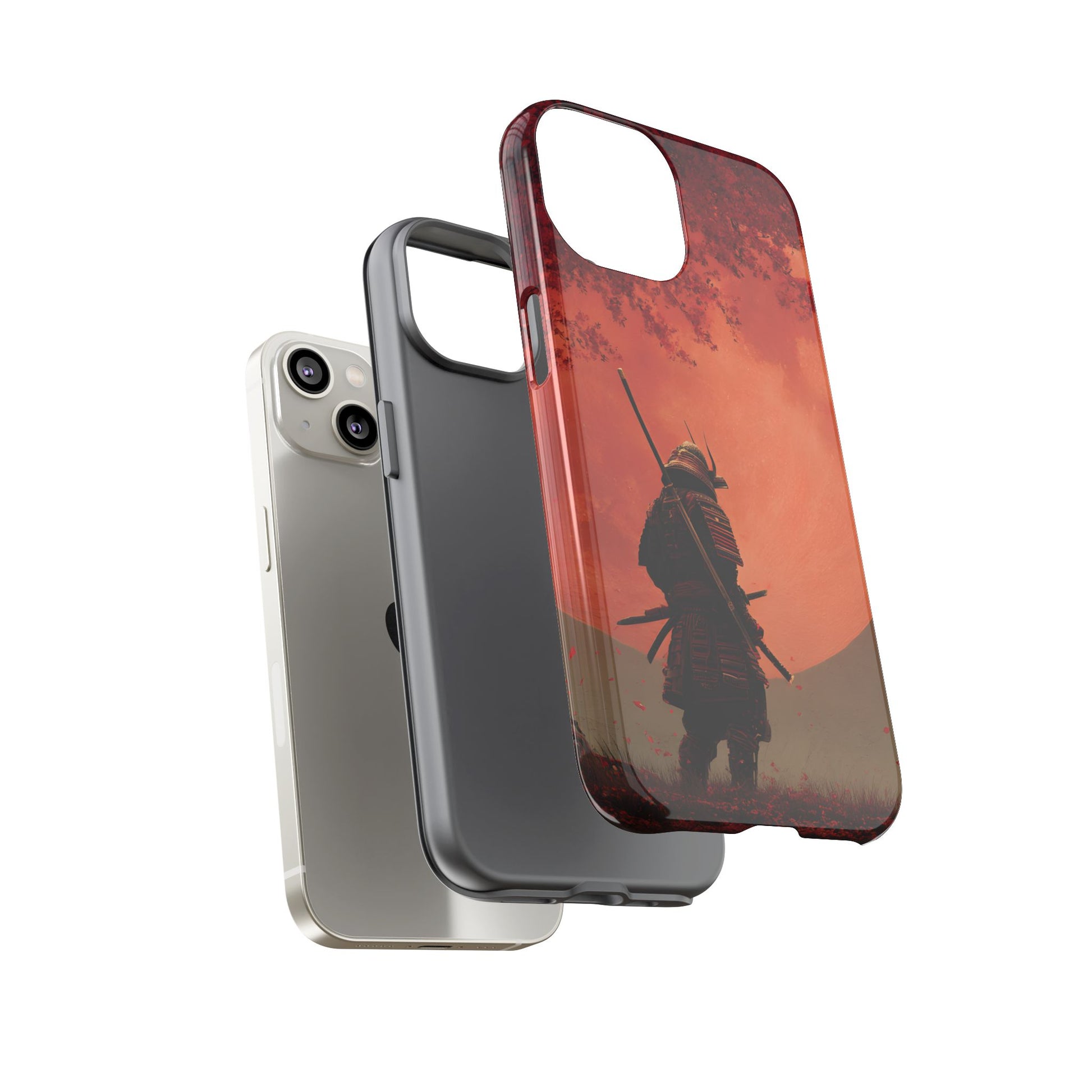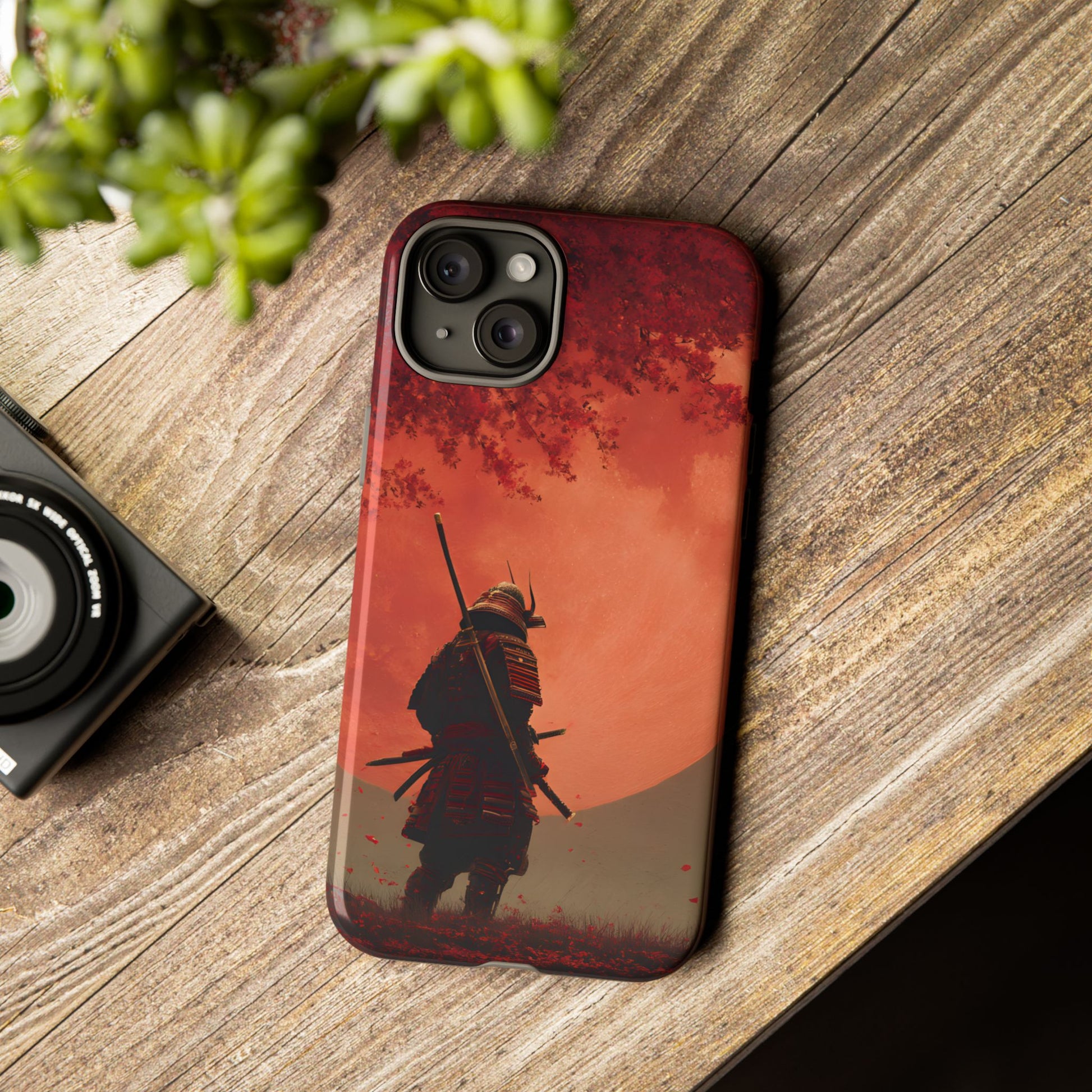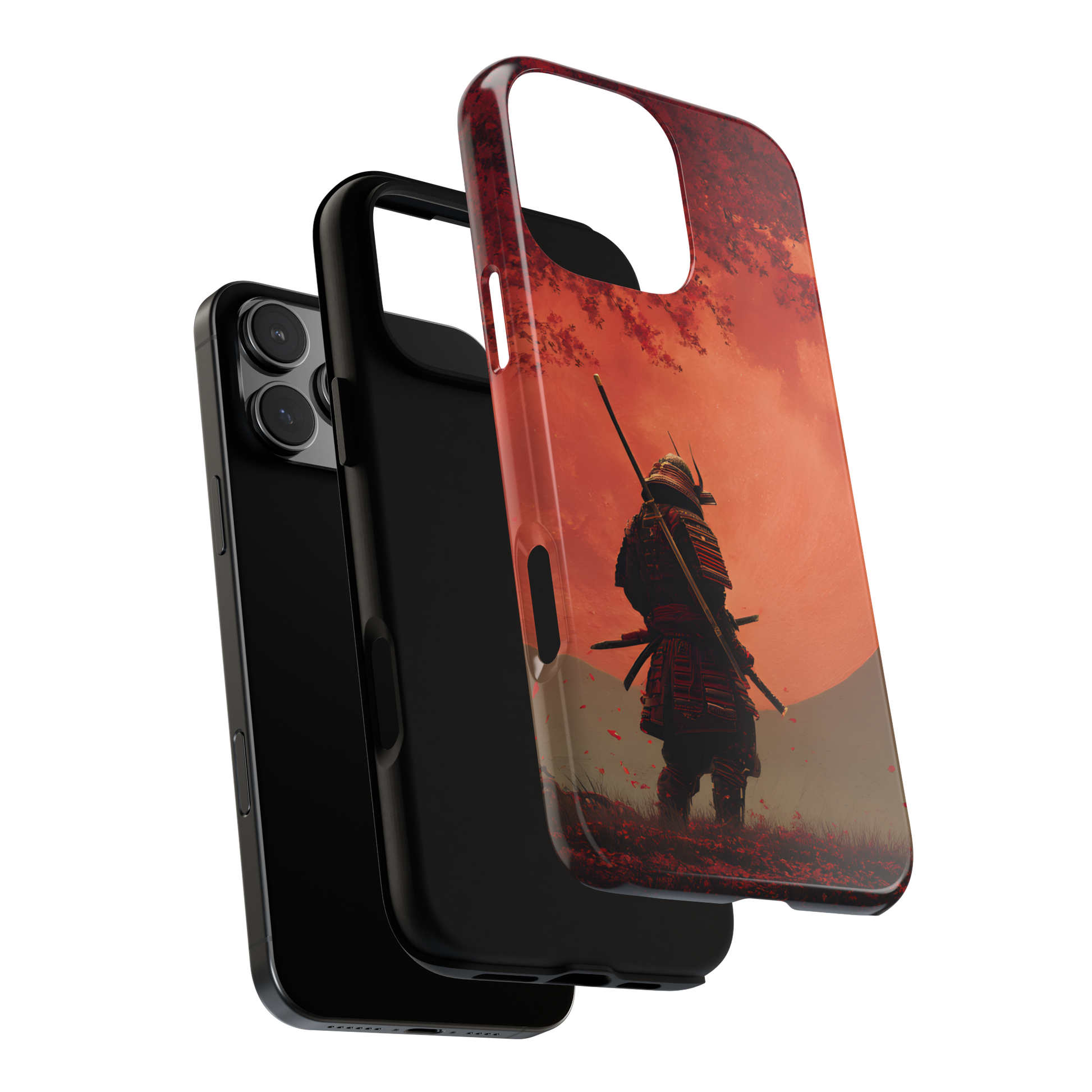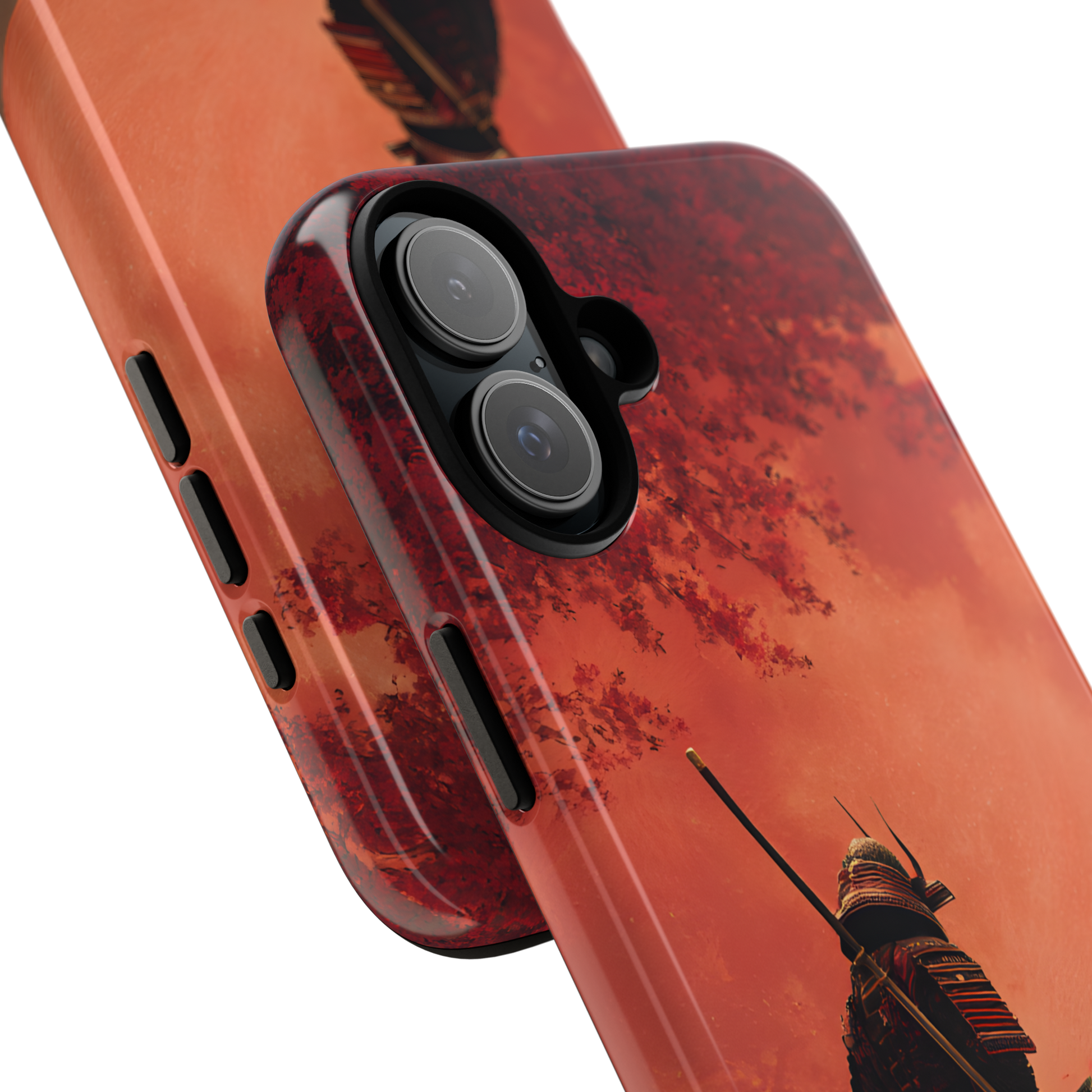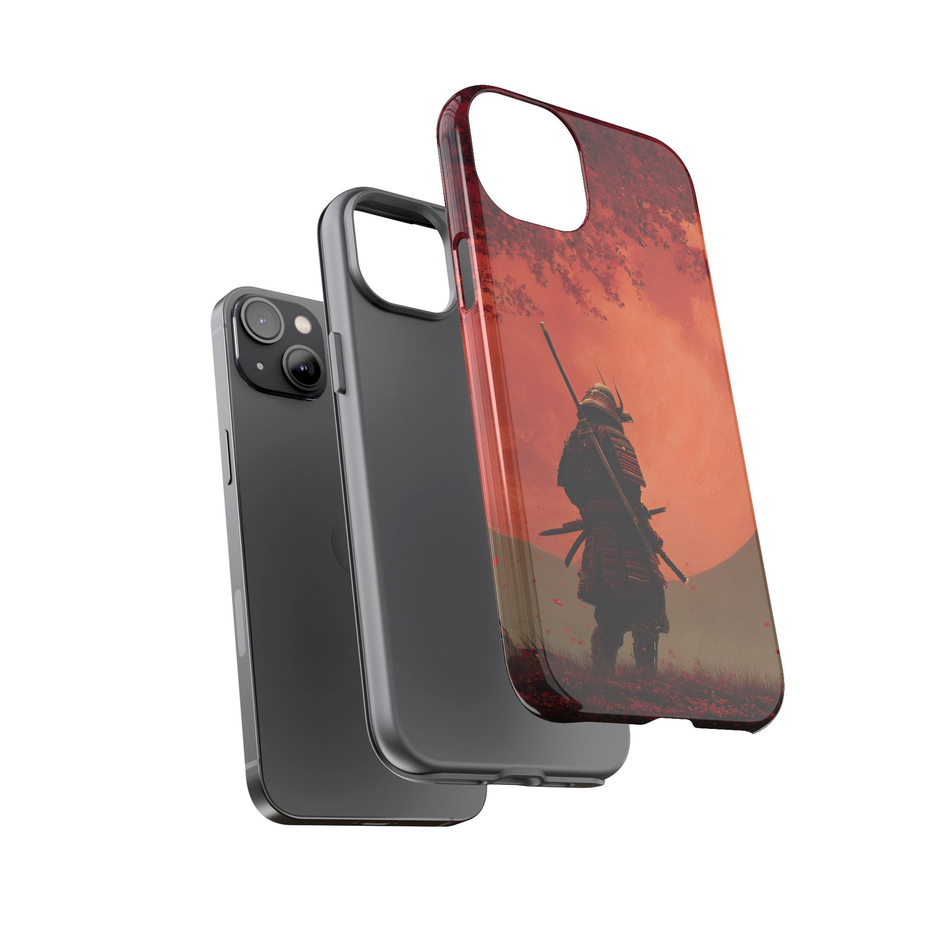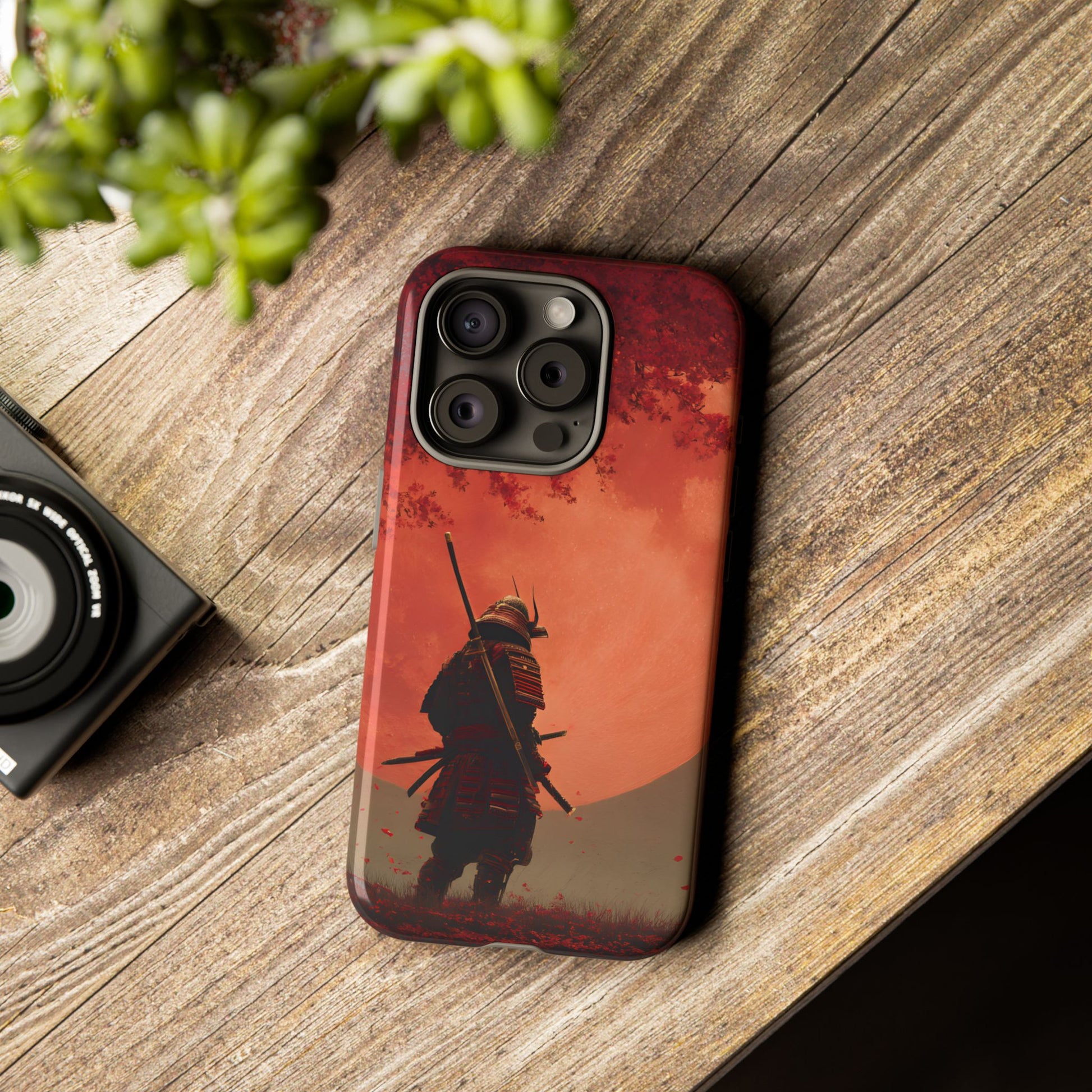 A lone samurai stands beneath a glowing blood-red moon, surrounded by drifting cherry blossoms and the silence of twilight. This striking design transforms your iPhone into a canvas of stillness, strength, and legend—perfect for those drawn to ancient honor, quiet power, and bold visuals.