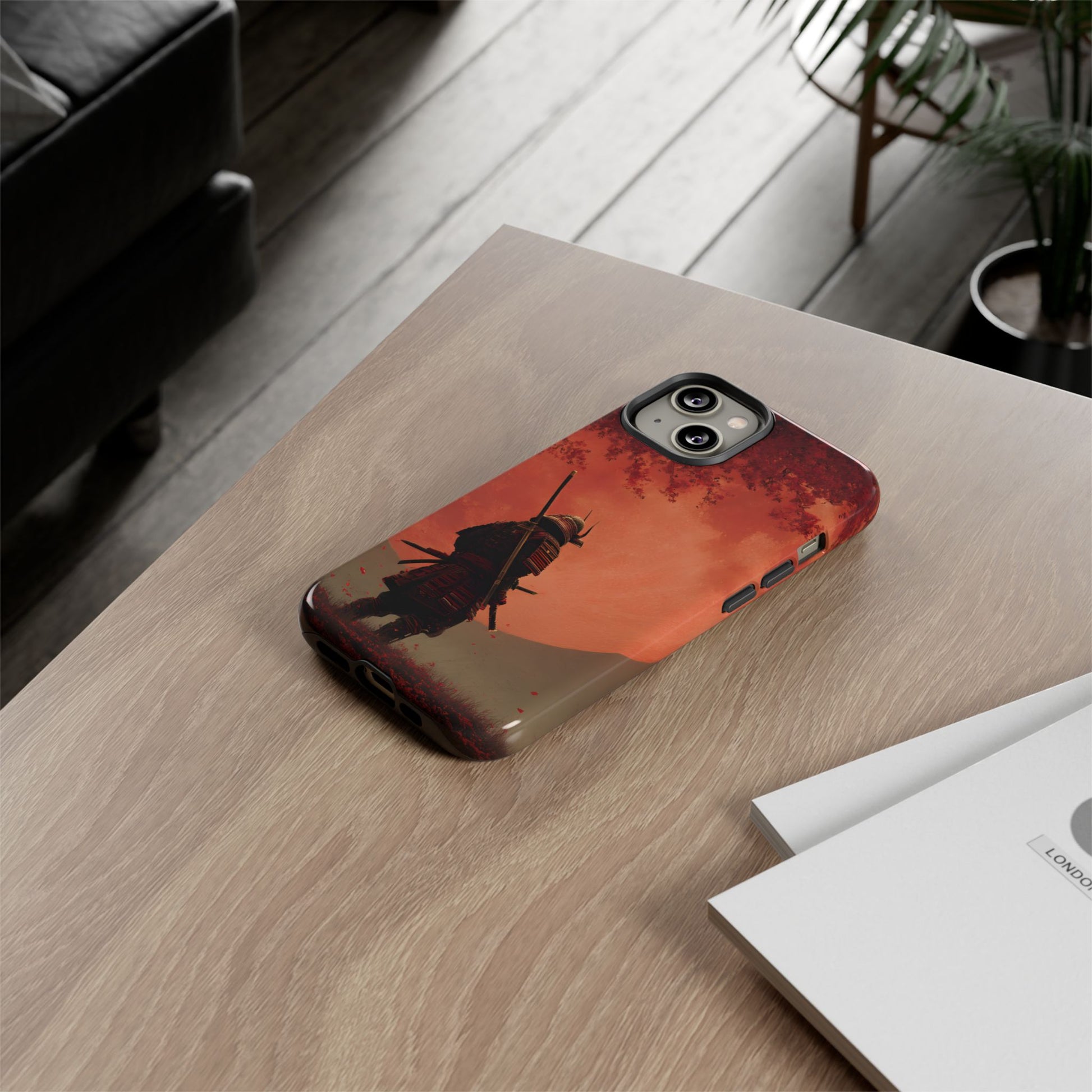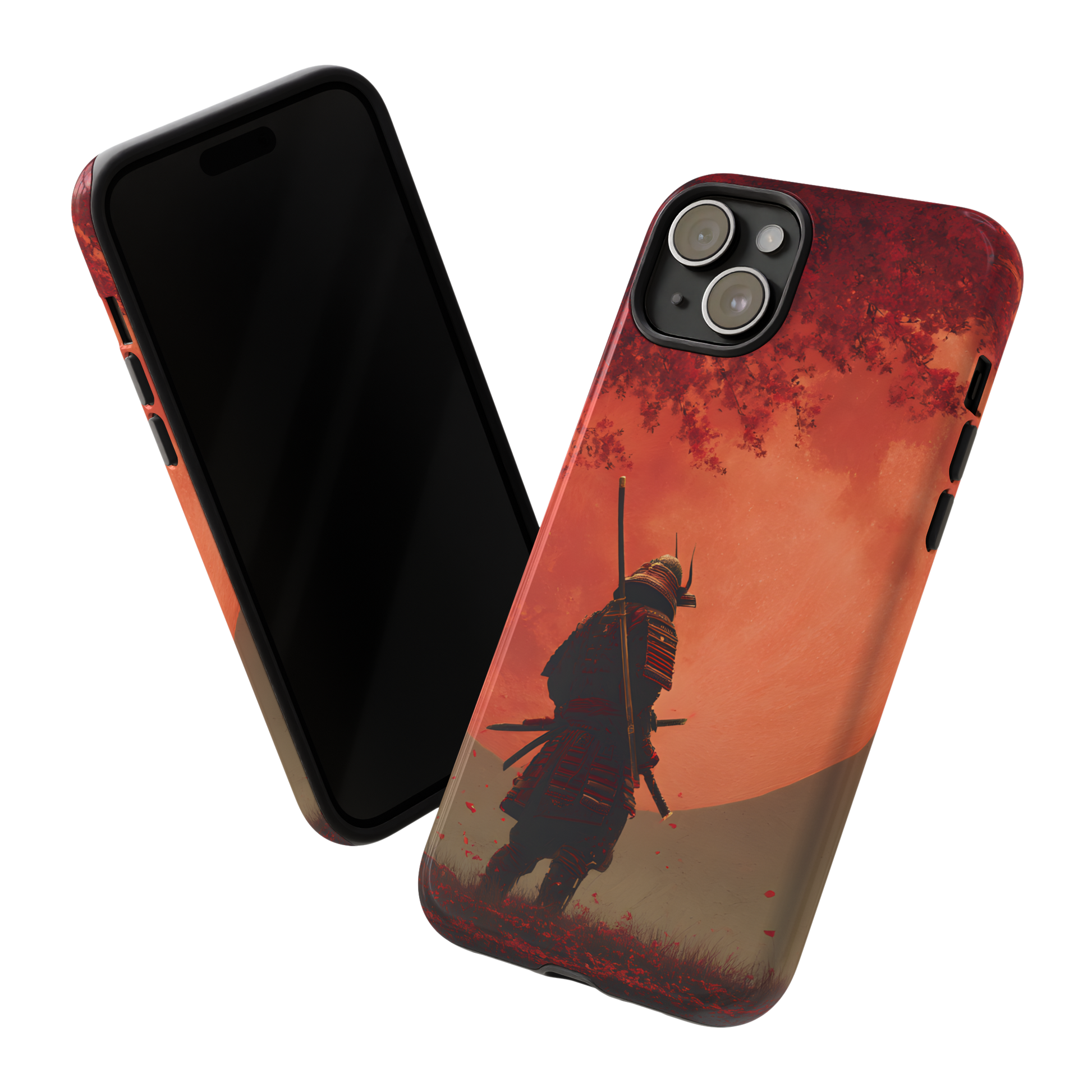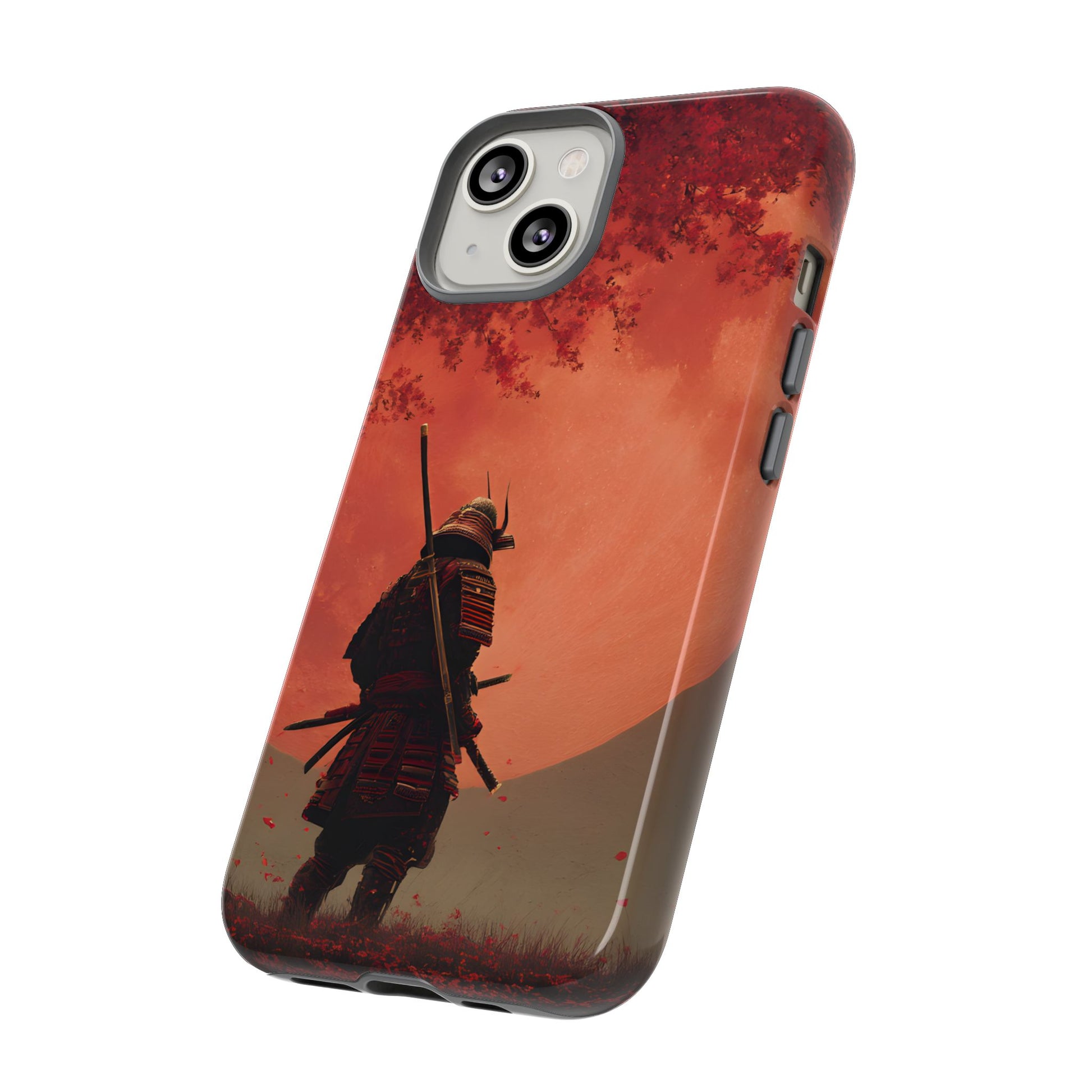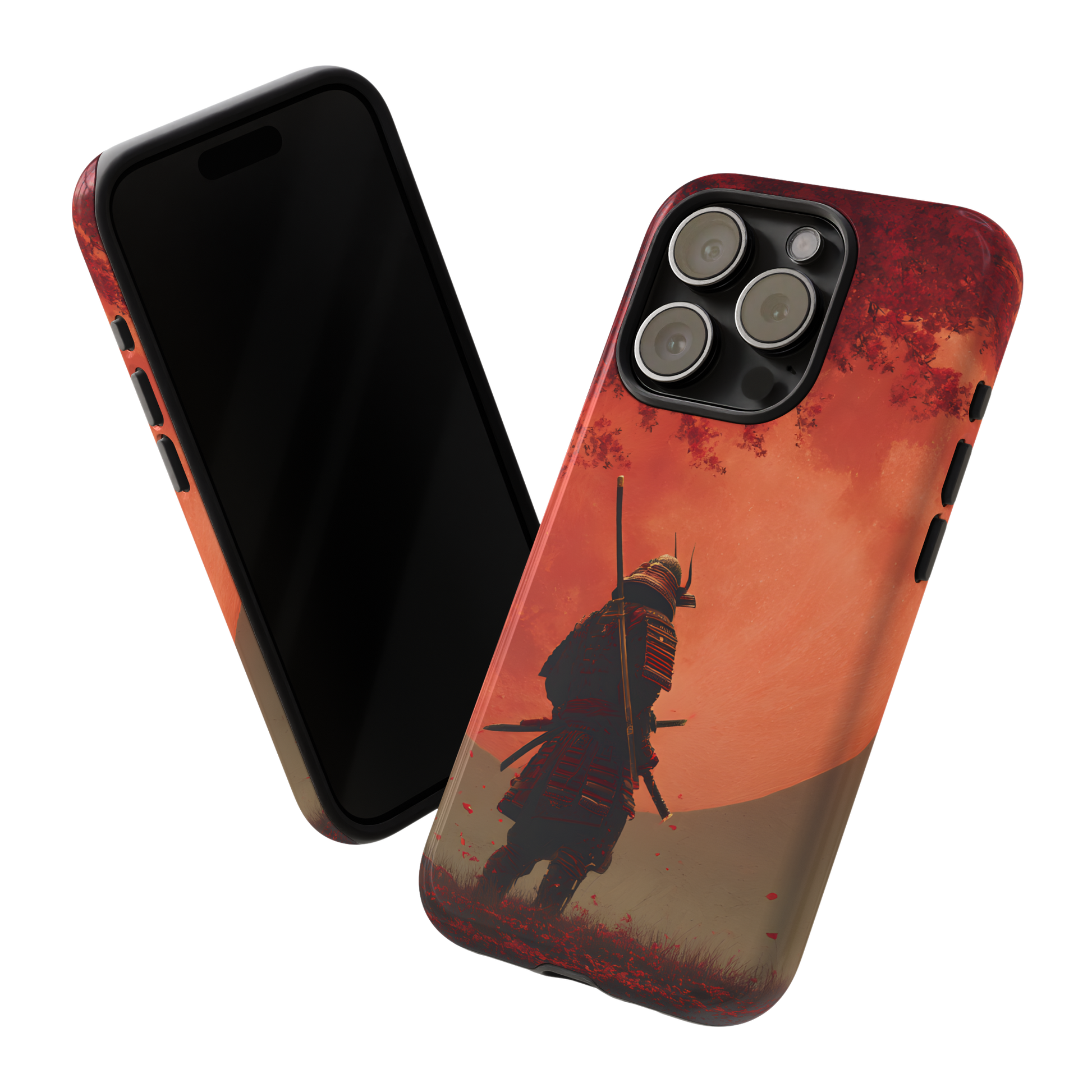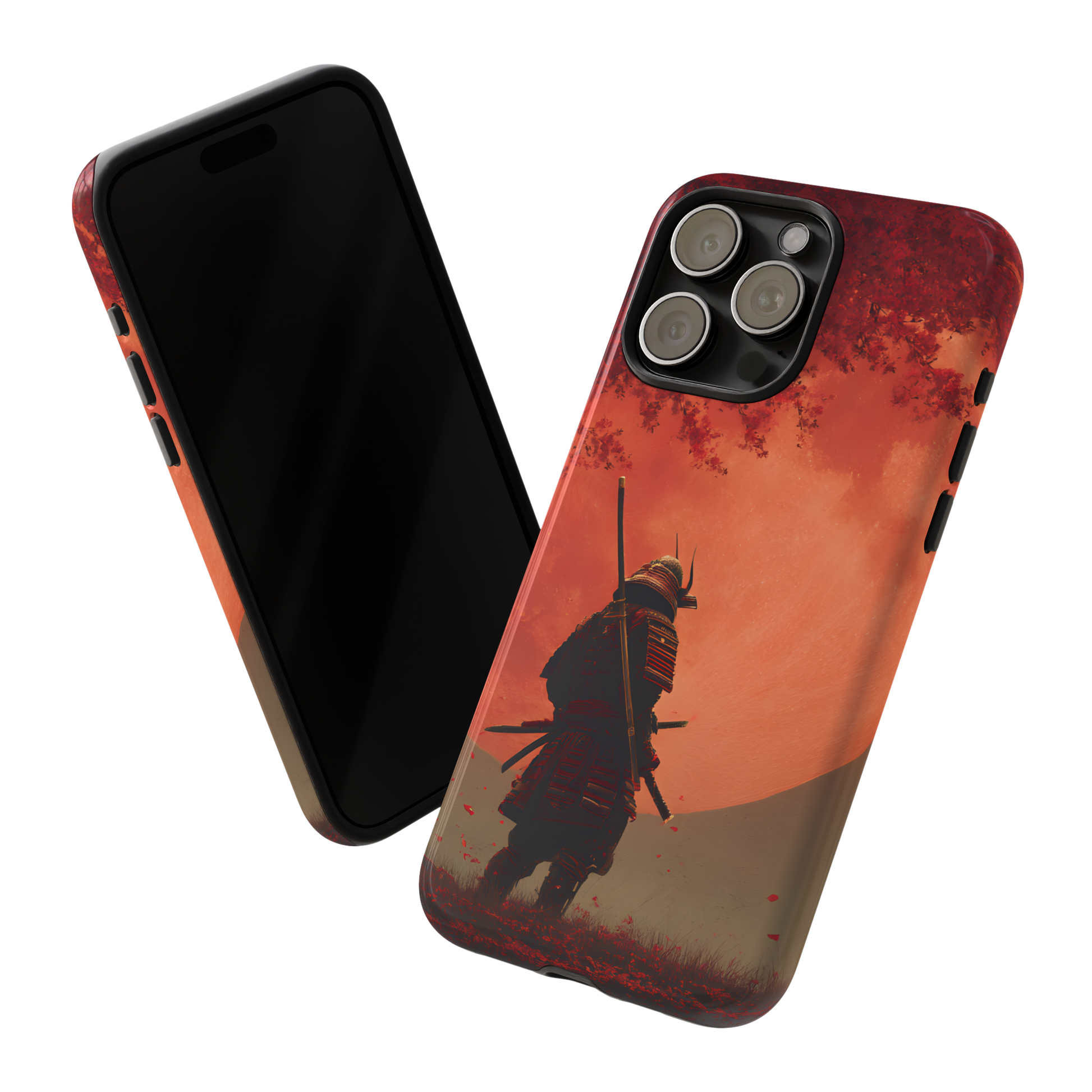 A lone samurai stands beneath a glowing blood-red moon, surrounded by drifting cherry blossoms and the silence of twilight. This striking design transforms your iPhone into a canvas of stillness, strength, and legend—perfect for those drawn to ancient honor, quiet power, and bold visuals.