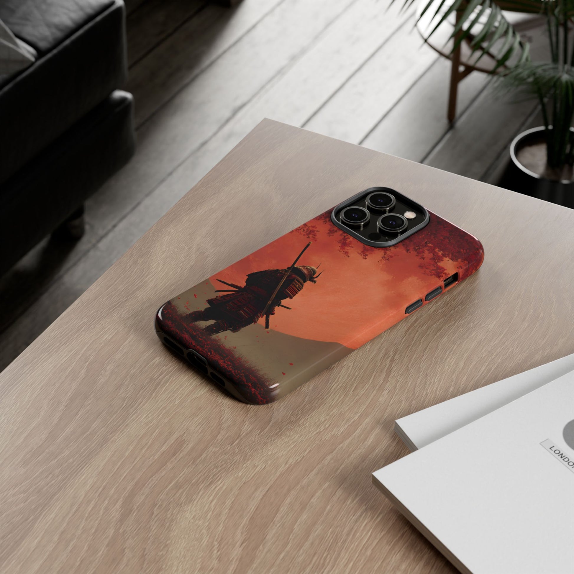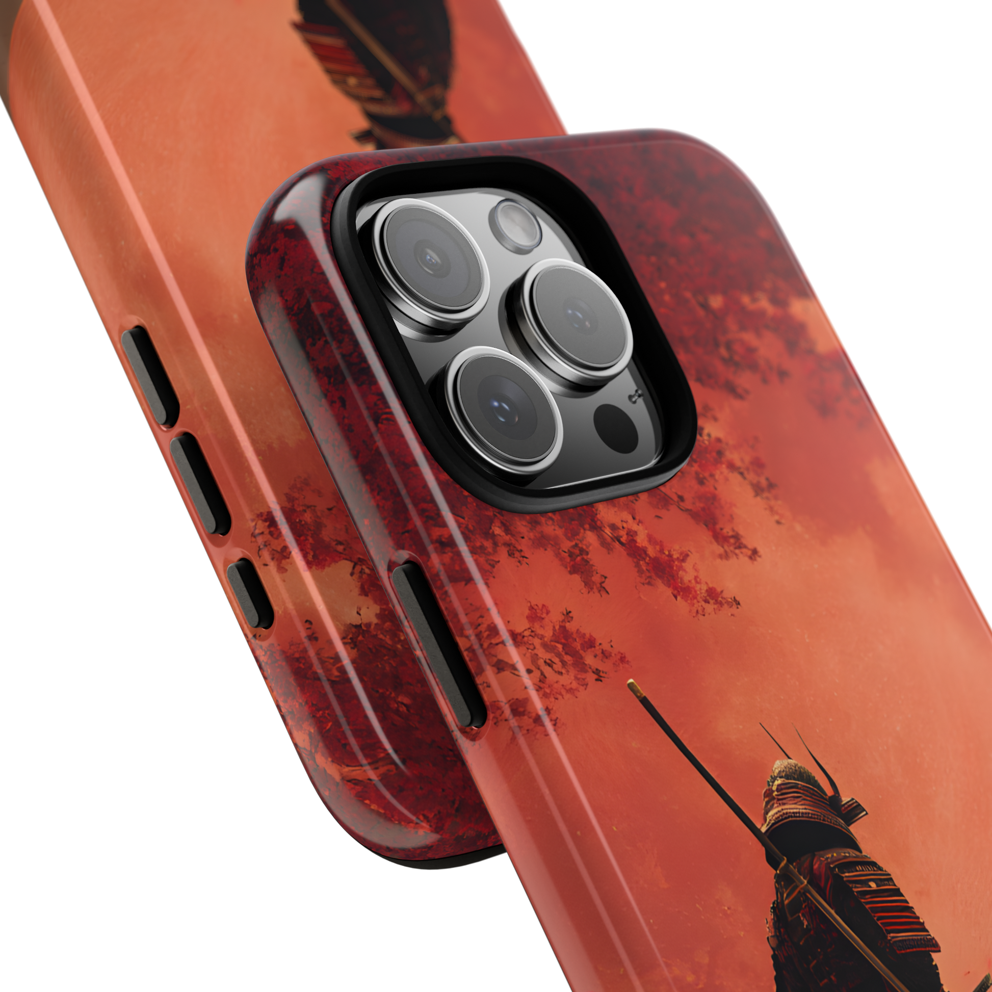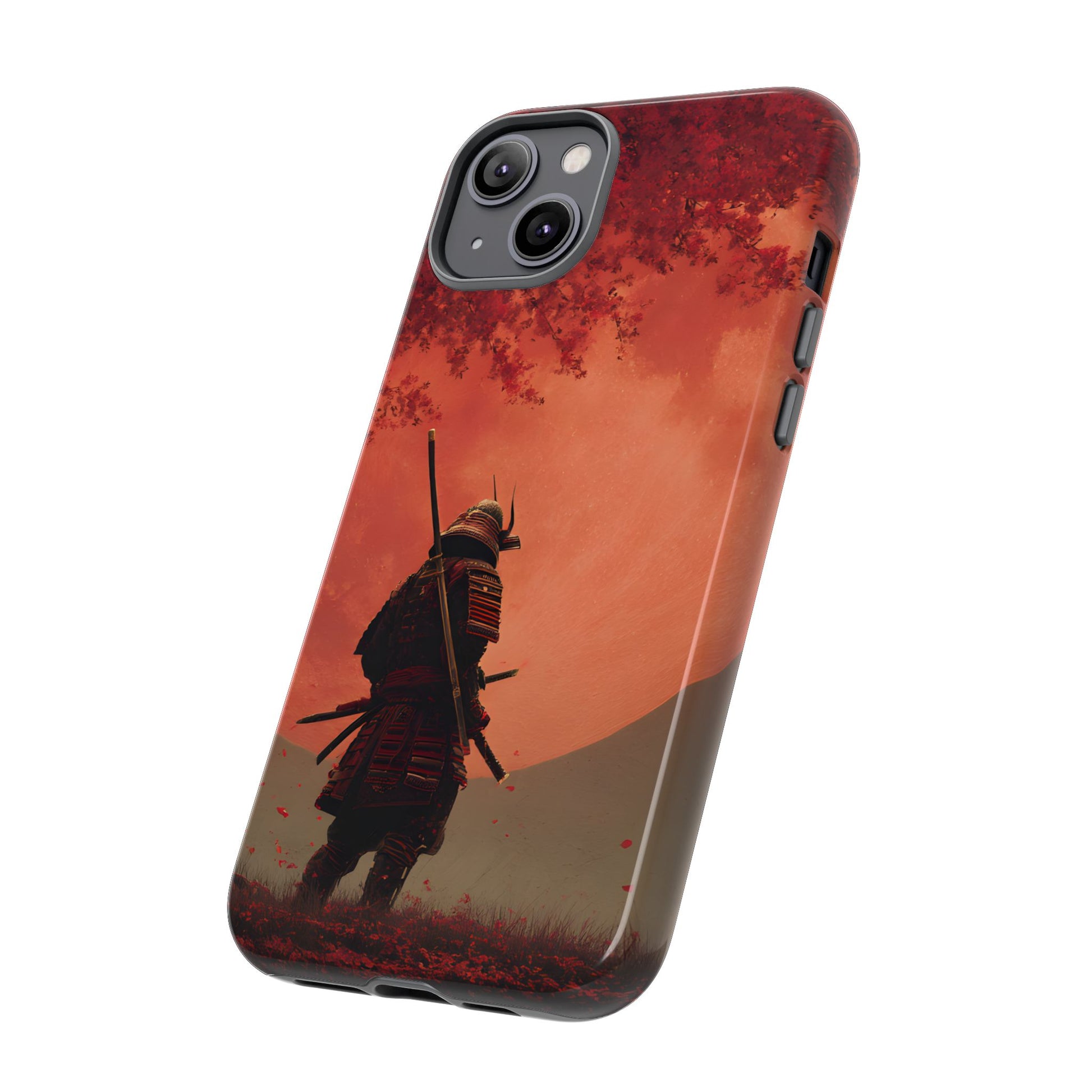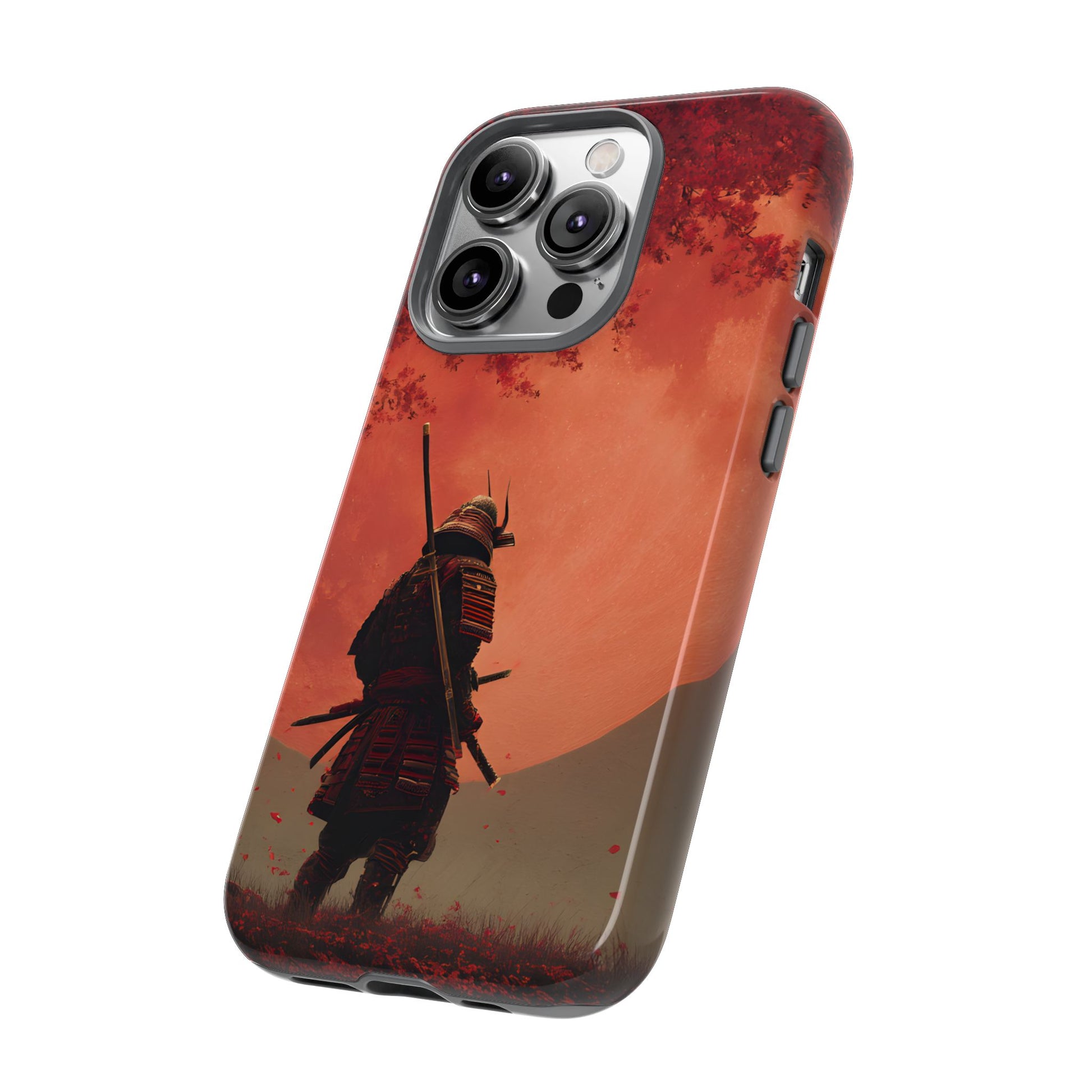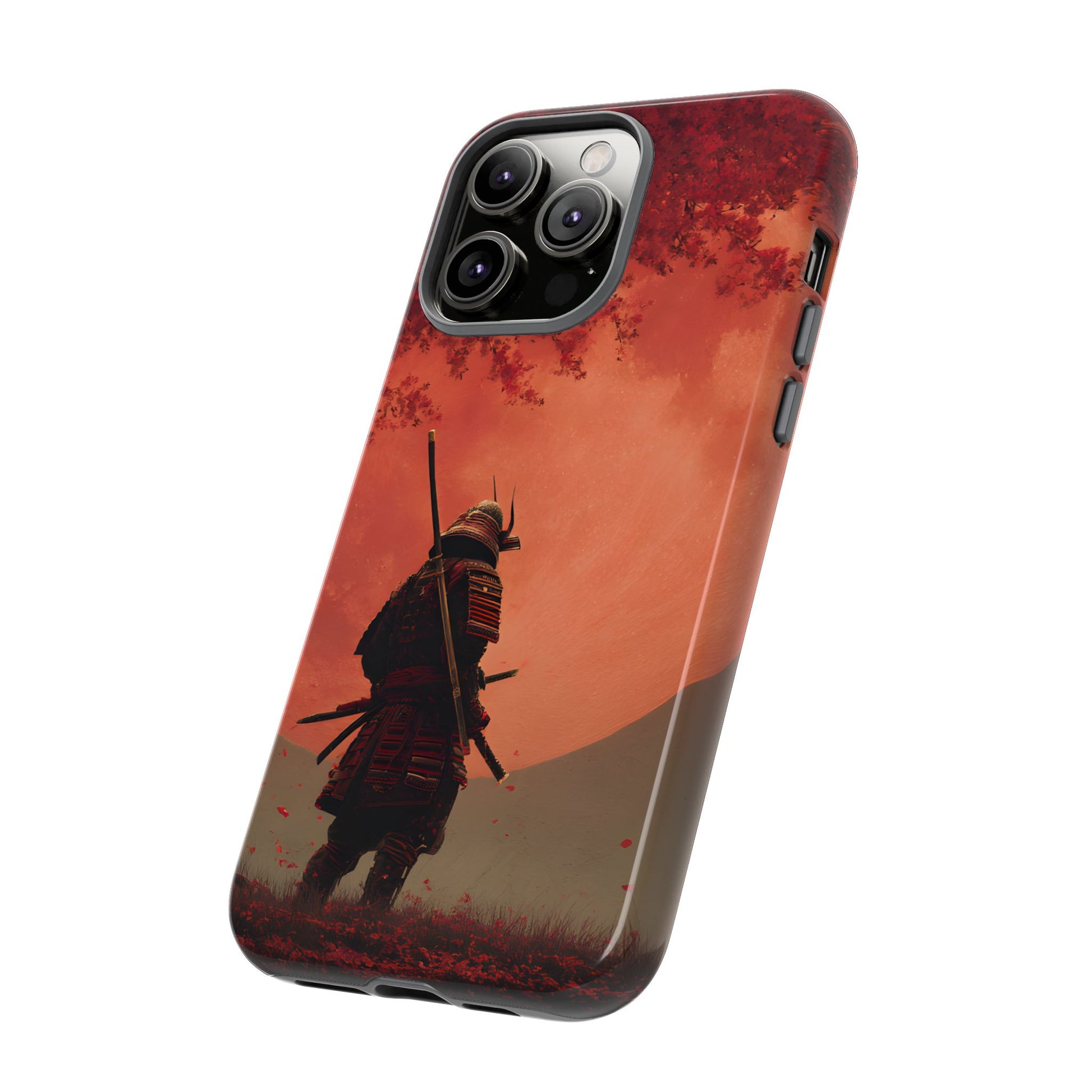 A lone samurai stands beneath a glowing blood-red moon, surrounded by drifting cherry blossoms and the silence of twilight. This striking design transforms your iPhone into a canvas of stillness, strength, and legend—perfect for those drawn to ancient honor, quiet power, and bold visuals.