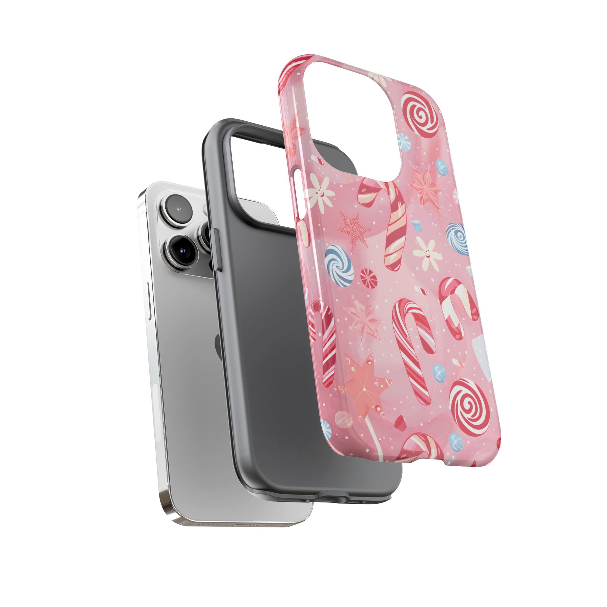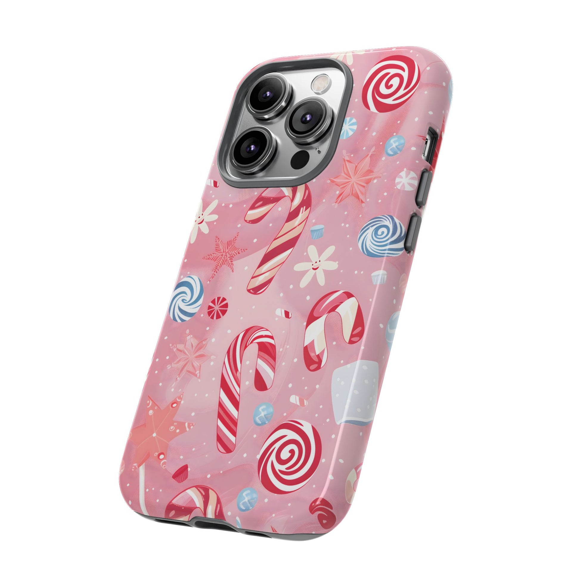 The vibrant red-and-white candy shapes pop beautifully against the soft pink base, and the glossy finish enhances every swirl and sparkle โ making this case the perfect blend of cute, festive, and eye-catching.