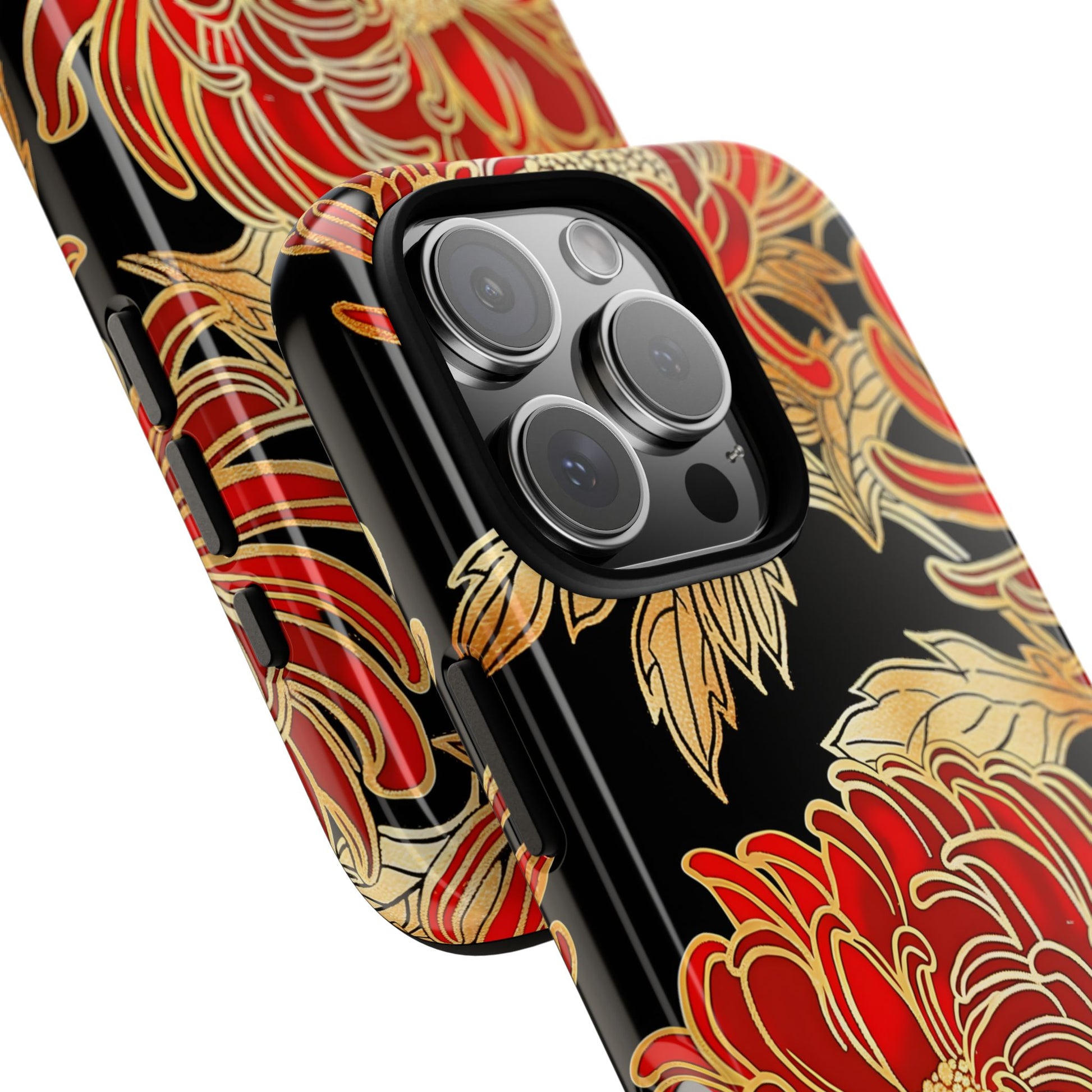 🔥 Oriental Floral Artwork – Red and gold chrysanthemum motifs on a rich black background