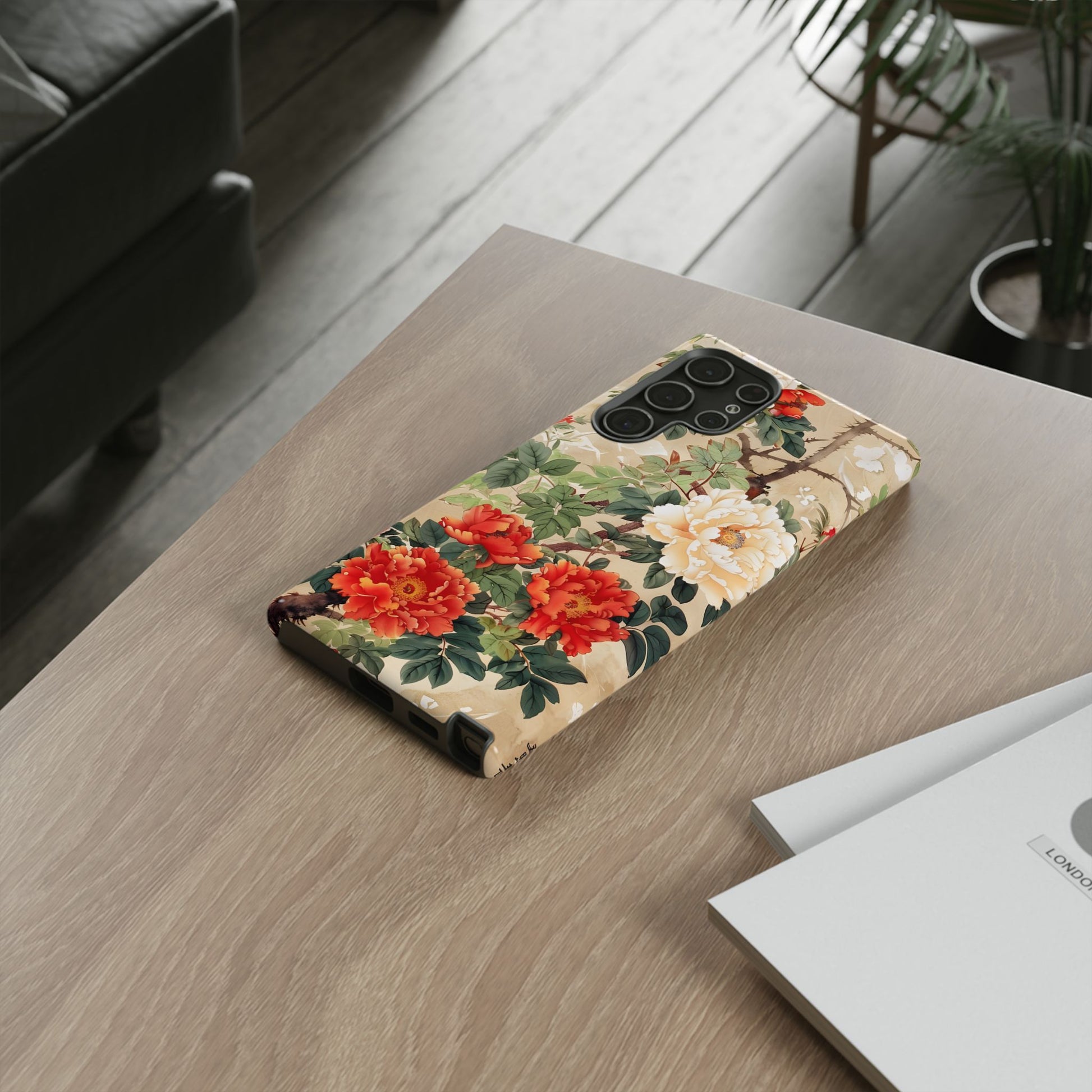 Graceful ivory and scarlet peonies bloom over an antique parchment backdrop. Imperial Bloom brings Japanese-inspired brushwork and refined florals to your Samsung Galaxy for an elegant, art-first look.