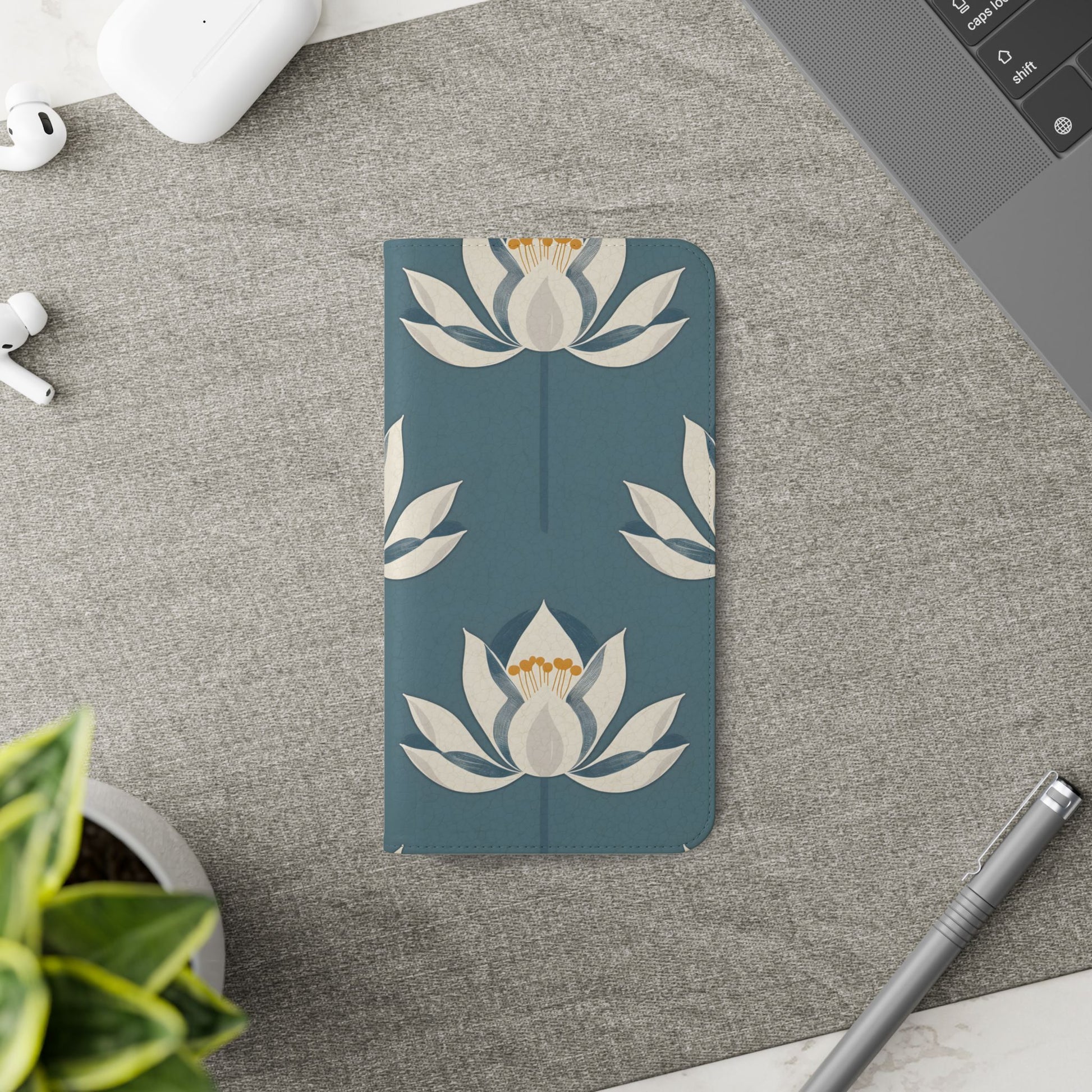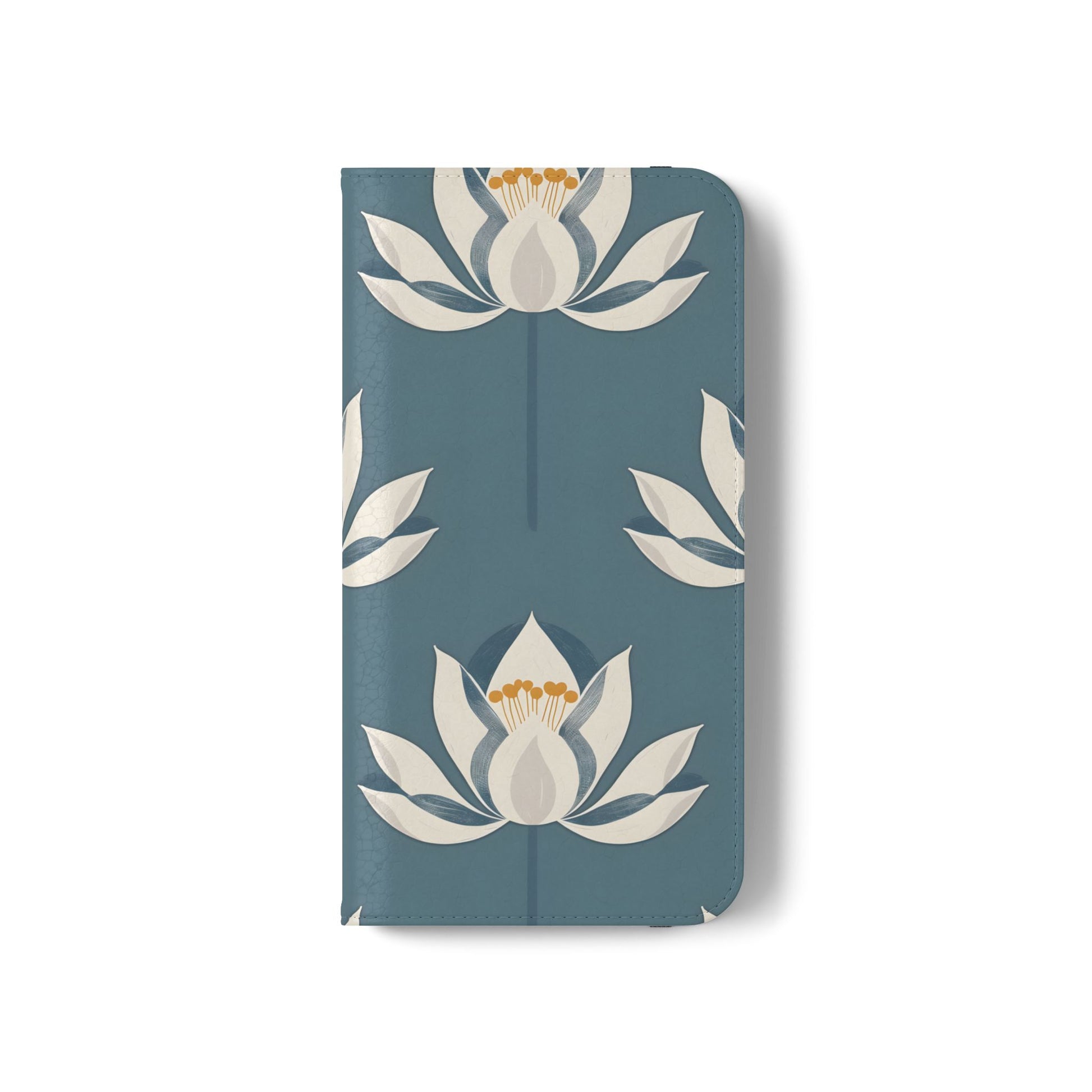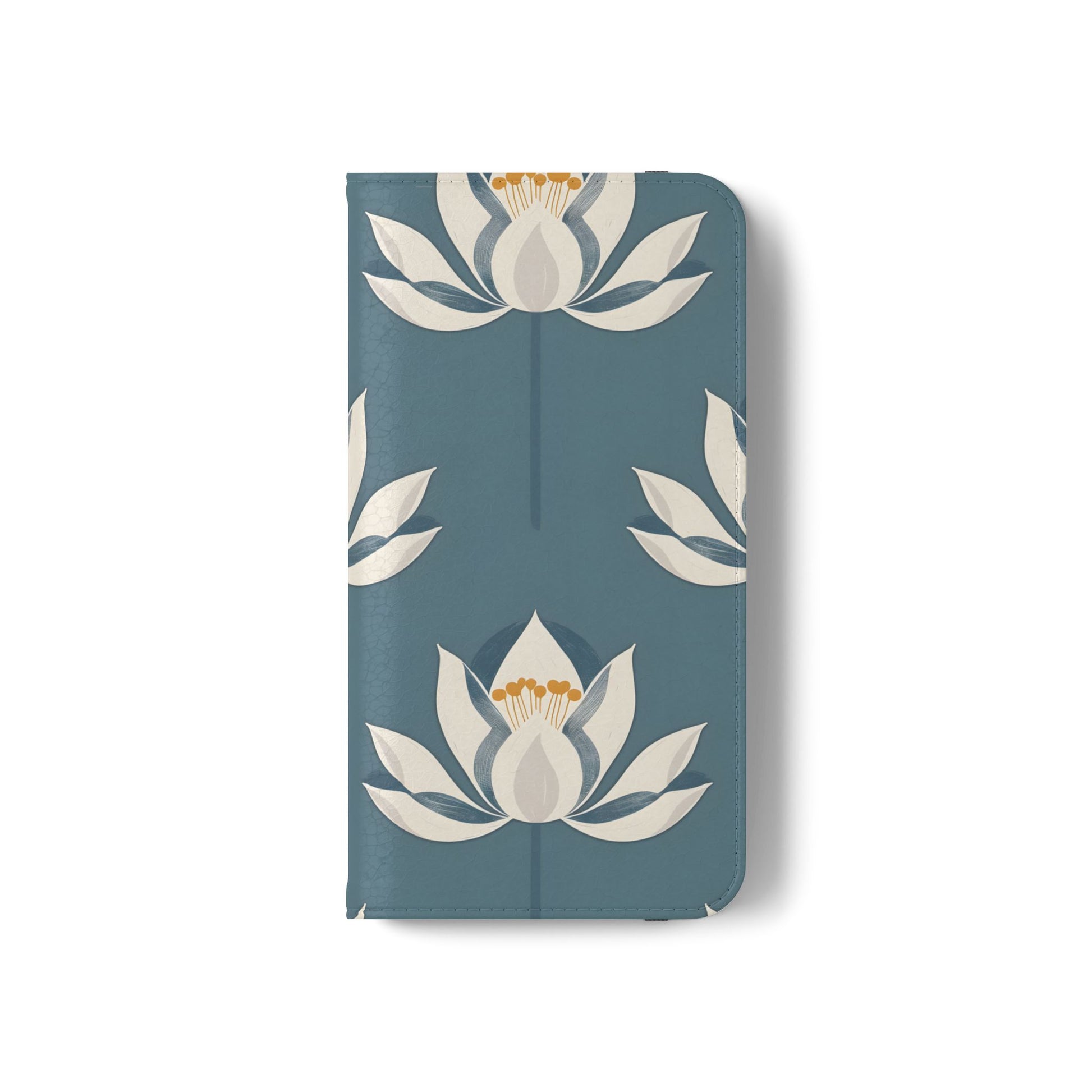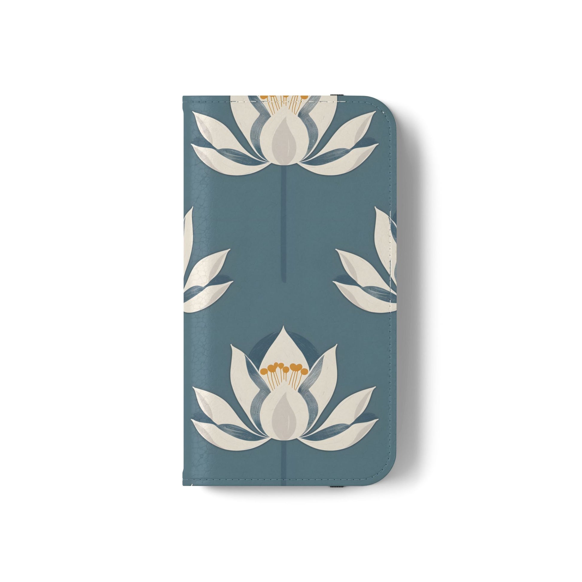Bring calm elegance to your everyday with the Lotus Serenity Vegan Leather Wallet Case. This design features a repeating pattern of graceful lotus blossoms set against a serene blue background. The soft ivory petals, accented with golden centers, symbolize purity and renewal—making your iPhone feel like more than just a device, but a piece of mindful art you carry with you.