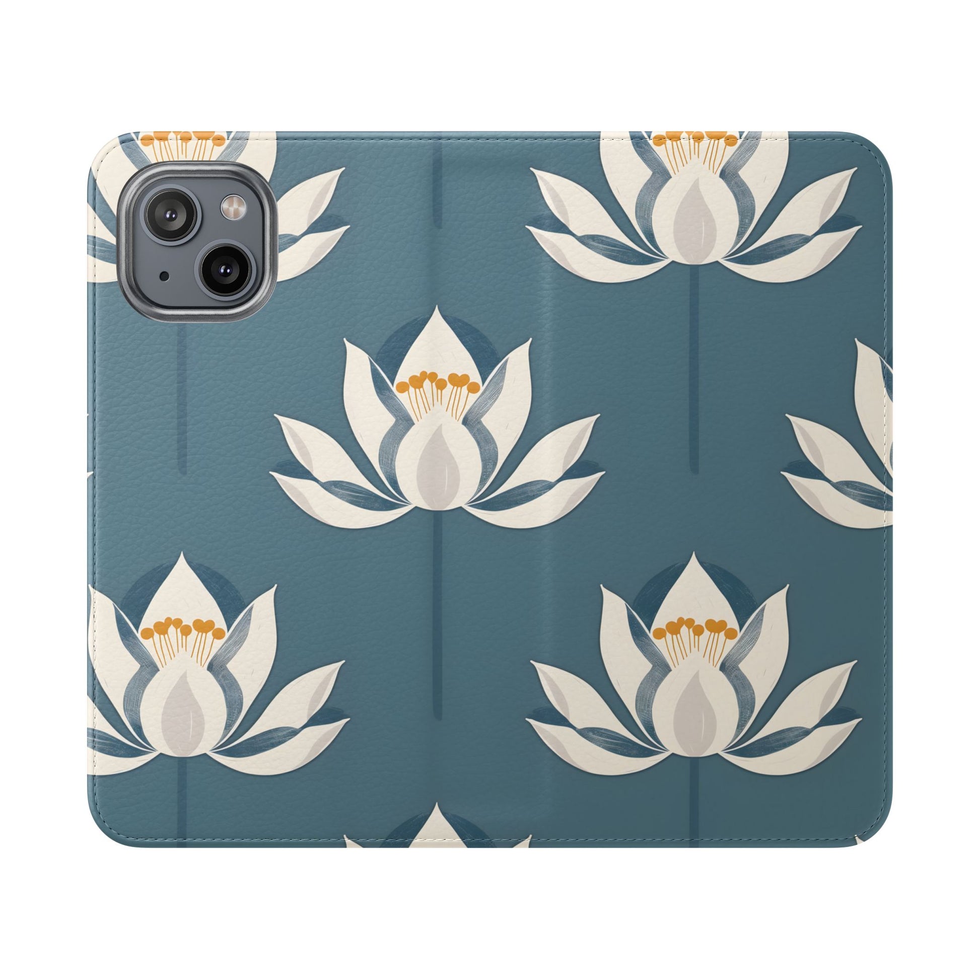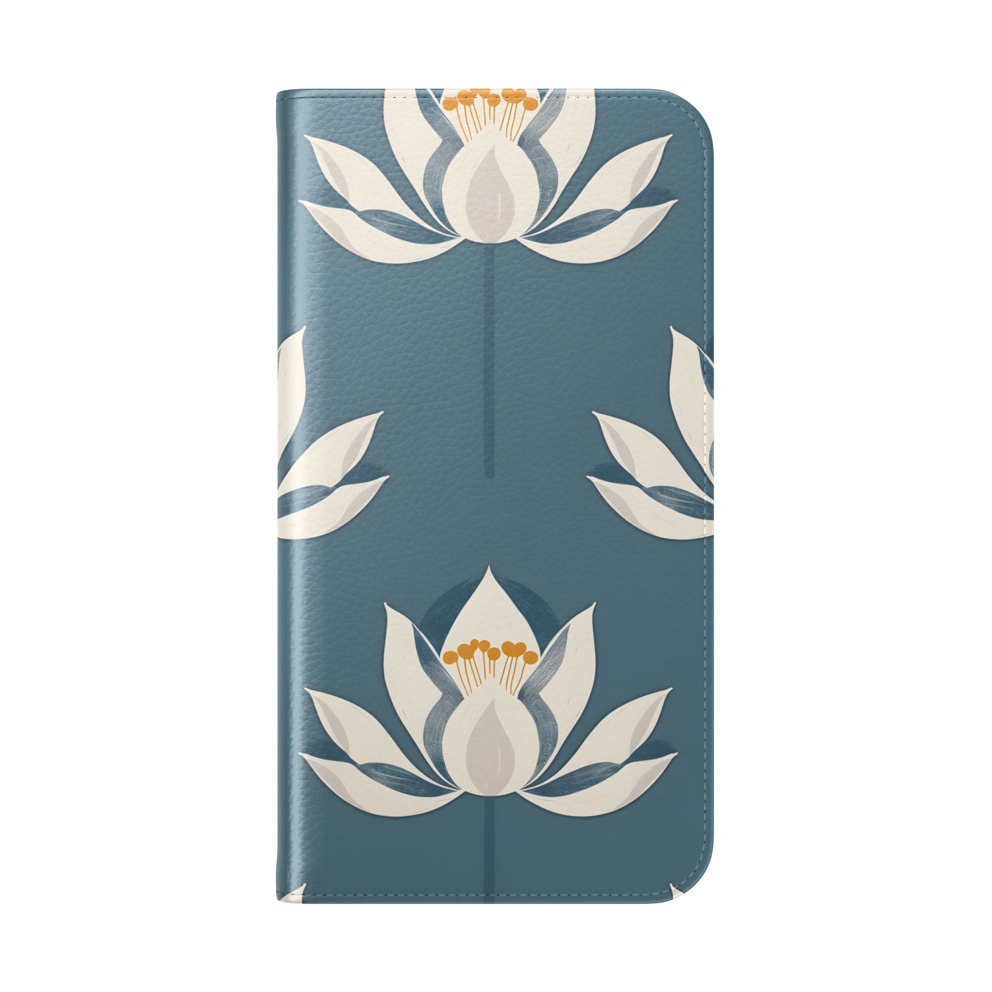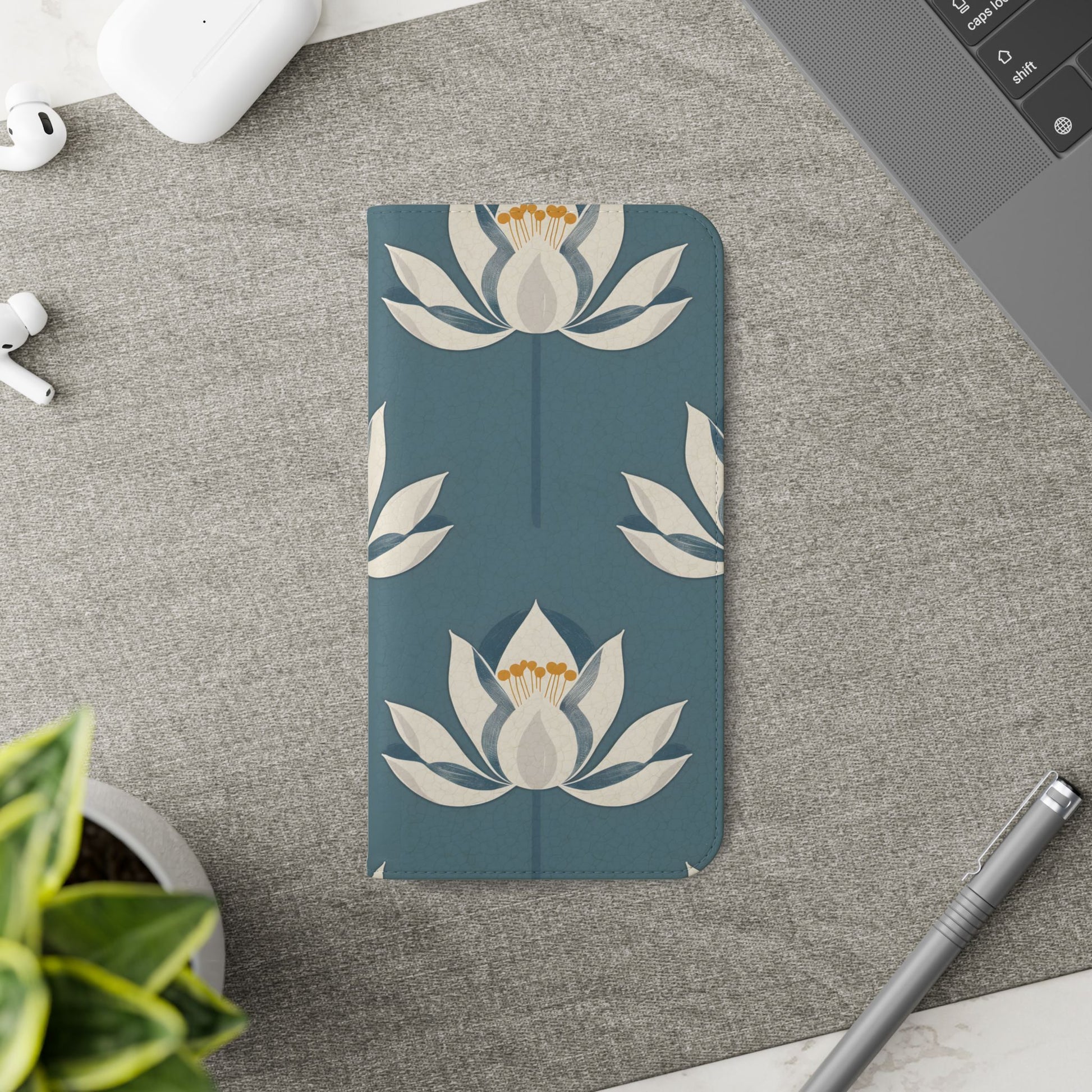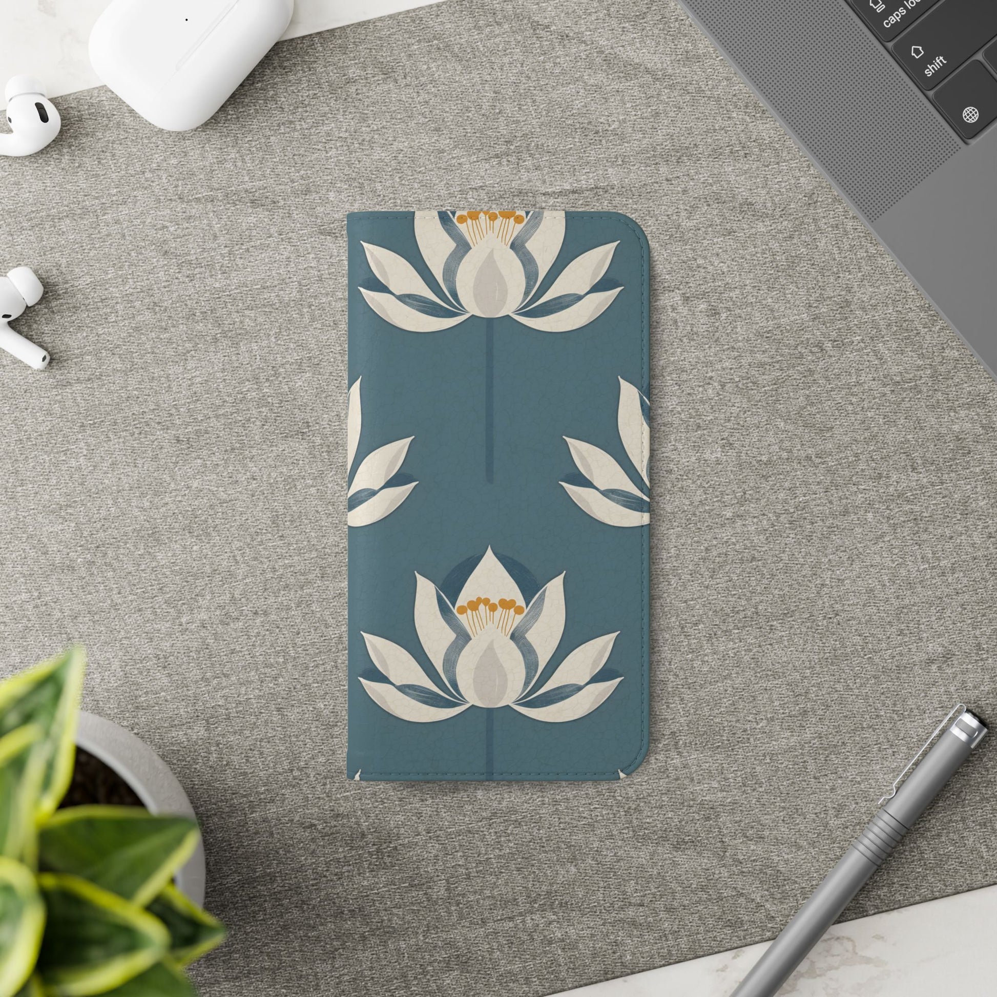 Bring calm elegance to your everyday with the Lotus Serenity Vegan Leather Wallet Case. This design features a repeating pattern of graceful lotus blossoms set against a serene blue background. The soft ivory petals, accented with golden centers, symbolize purity and renewal—making your iPhone feel like more than just a device, but a piece of mindful art you carry with you.