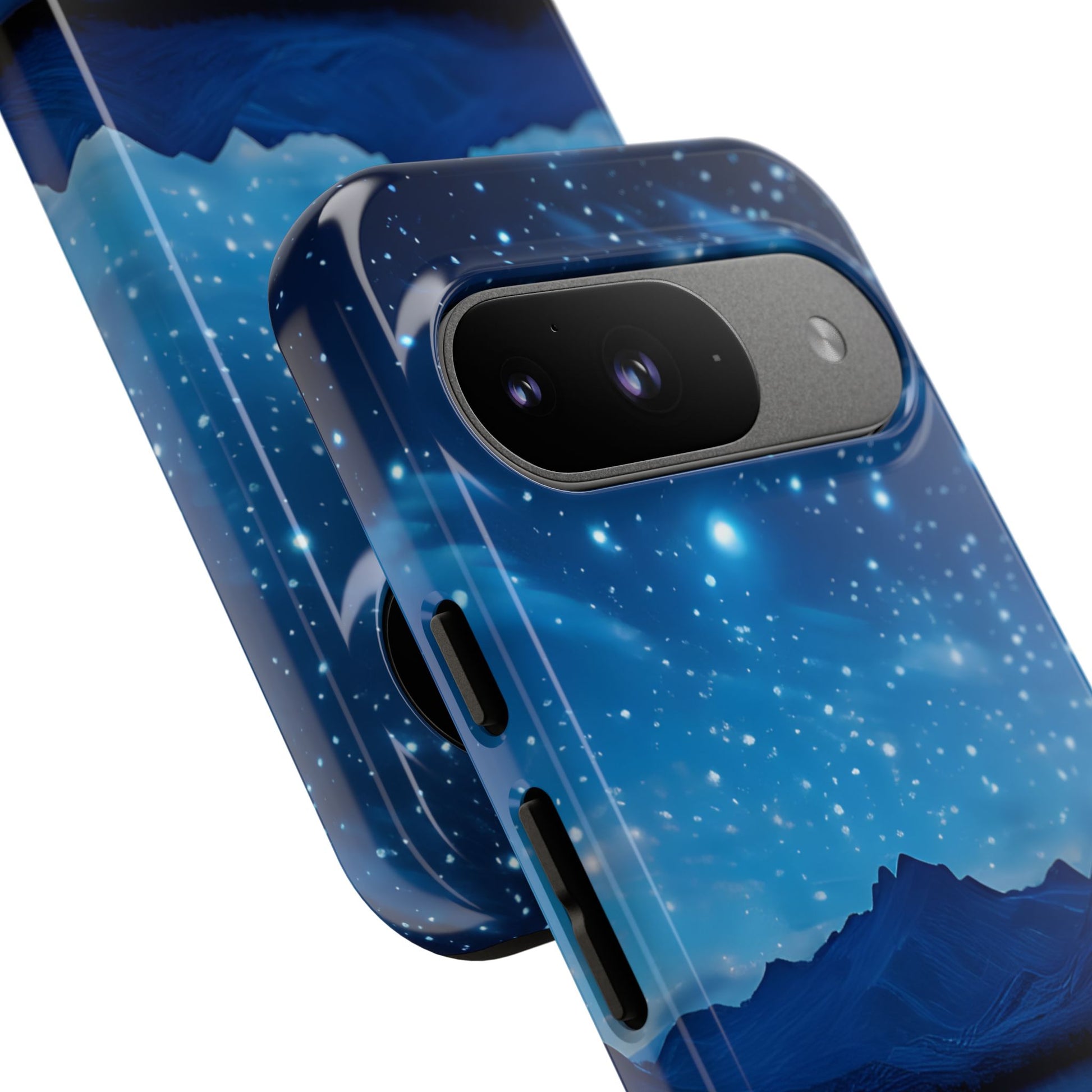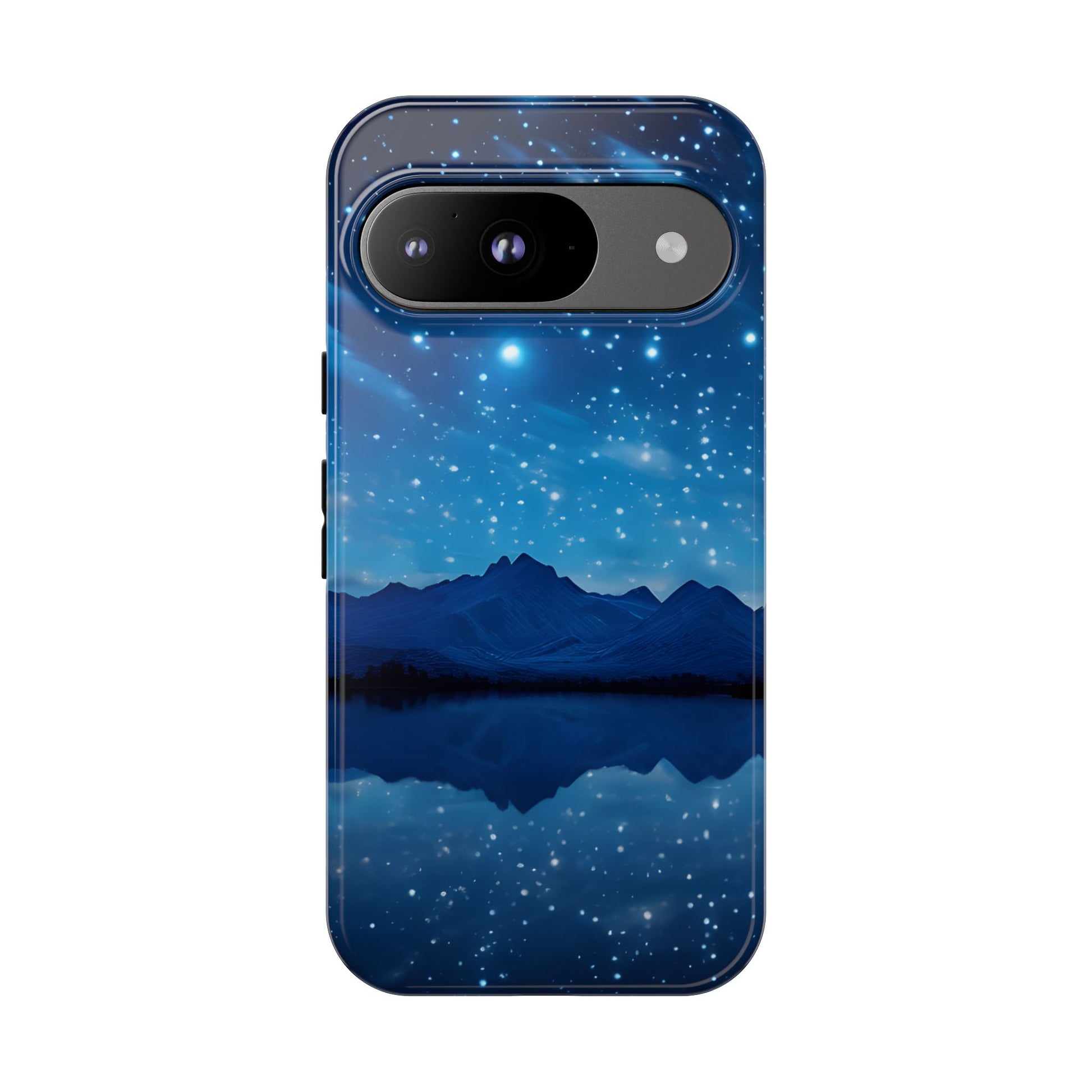 The Starlit Reflection Google Pixel phone case captures the quiet magic of a midnight sky, where thousands of shimmering stars stretch across the heavens and glisten in mirrored waters below. A silhouette of deep blue mountains adds depth and mystery, making this case a perfect match for stargazers, nature lovers, and dreamers who carry a piece of the night wherever they go.