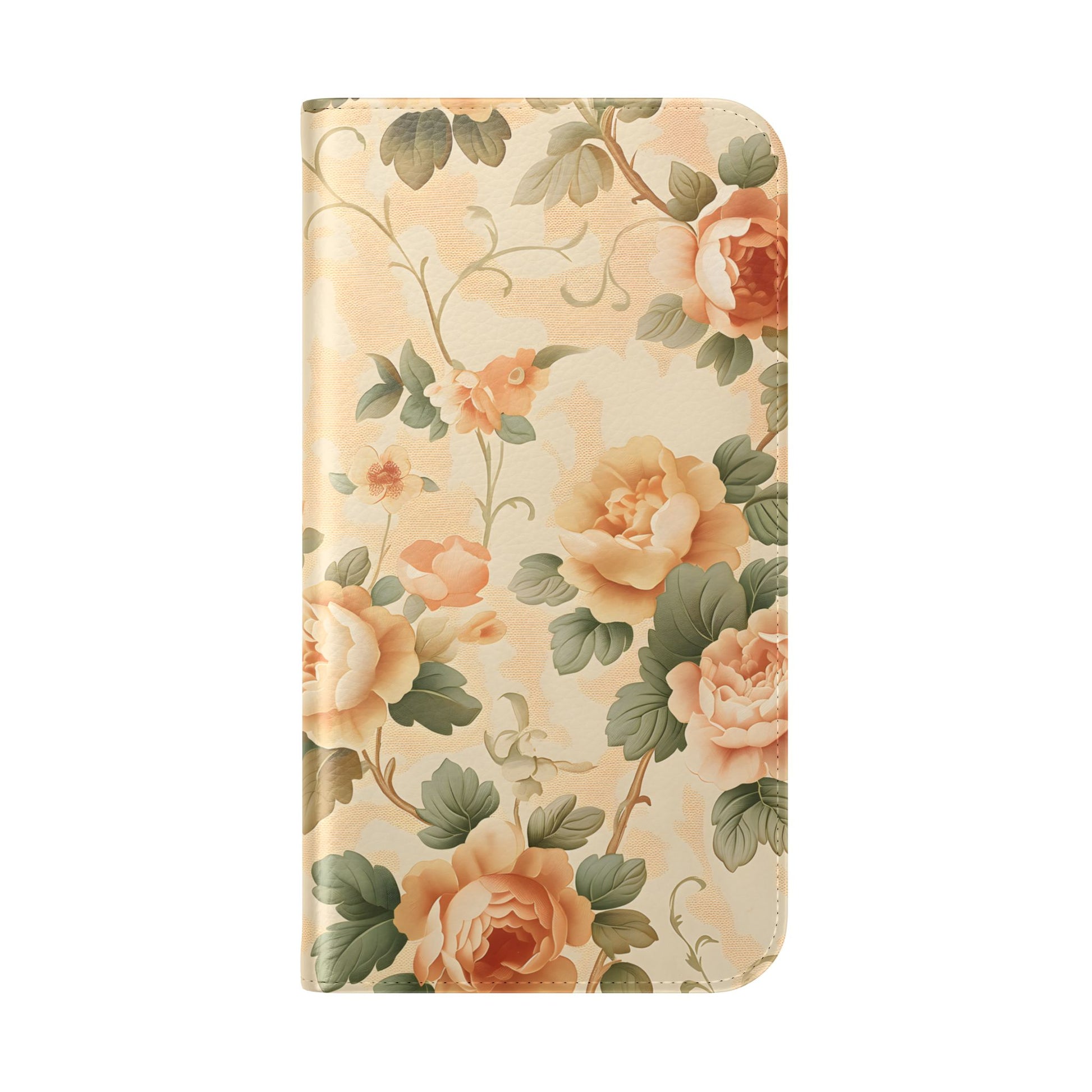 Step into timeless elegance with Vintage Bloom, a case design inspired by classic Victorian wallpaper artistry. Soft peach and blush roses unfurl across a warm cream backdrop, their petals interlacing with delicate vines and leafy greens. This floral composition evokes the charm of antique interiors while bringing a refined romantic touch to your modern iPhone.